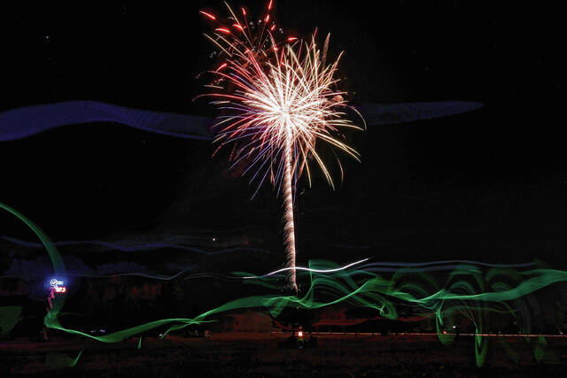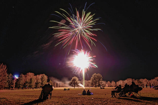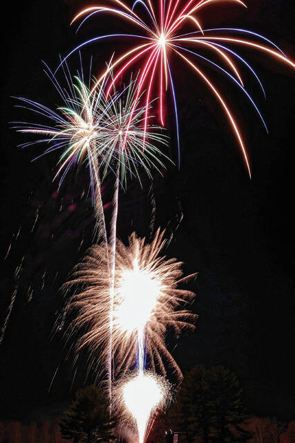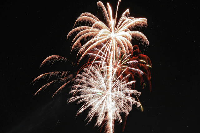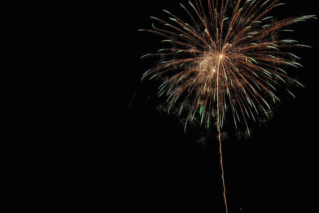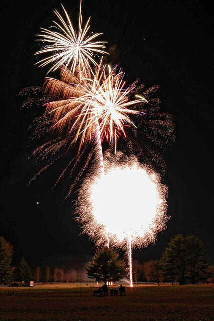 Mike Wolanin | The Republic Fireworks explode in the night sky during QMIX Christmas Musical Fireworks at Ceraland in Columbus, Ind., Friday, Dec. 3, 2021.