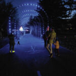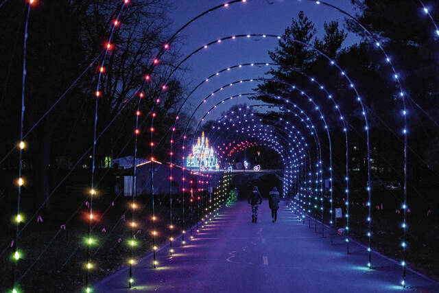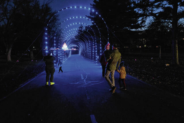 Mike Wolanin | The Republic People check out a tunnel of lights before QMIX Christmas Musical Fireworks at Ceraland in Columbus, Ind., Friday, Dec. 3, 2021.