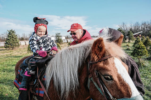 Mark Romine situates his granddaughter Ada Rutan on a horse named Buttercup to walk her around Romine Tree Farm on Wednesday in Hope.