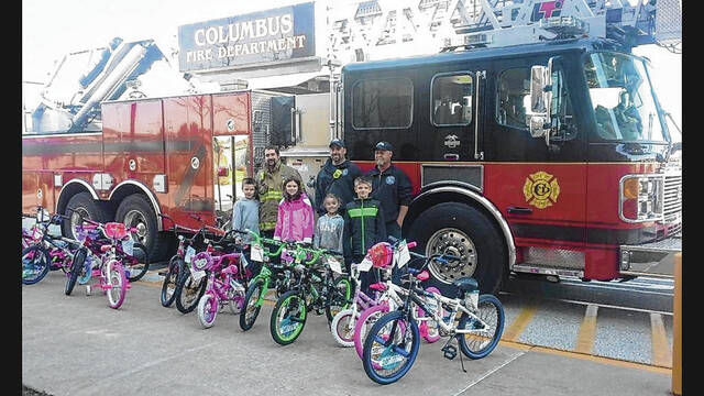 Photo provided In this photo, taken in 2014 which was the first year for Friendship Wheels, the kids, left-right,Ty Greathouse, Siddha Hall, Cameron Greathouse and Solomon Hall are shown with the bikes to be donated with Columbus firefighters Bryan Bailey, Allan James and Craig Weddel.