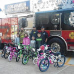 Photo provided Siddha Hall and Solomon Hall are shown with this year’s bike’s donations for the Columbus Firemen’s Cheer Fund distribution.