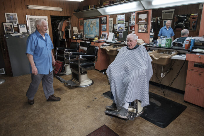 Mike Wolanin | The Republic Bob Condon prepares to cut Dave Richey’s hair in his barbershop on 17th Street in Columbus, Ind., Thursday, Dec. 9, 2021. Condon, 91, has been cutting hair in this location since he opened his barbershop in 1958.