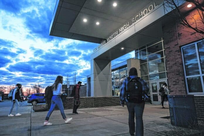 Students arrive at Columbus North High School on the first day of school after spring break in Columbus, Ind., Monday, March 22, 2021. Following new Centers for Disease Control and Prevention guidelines, BCSC and Flat Rock-Hawcreek school corporations have fully reopened their schools for in-person classes. Parents are still allow to keep their children in virtual learning if they choose to until the end of the school year. Mike Wolanin | The Republic Mike Wolanin | The Republic