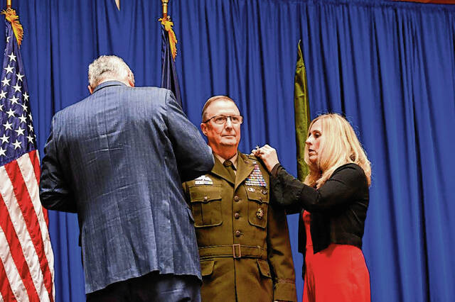 Indiana’s Adjutant General, Brig. Gen. R. Dale Lyles, center, receives his second star in his promotion ceremony to major general from his wife, Sherry, right, and Indiana Gov. Eric Holcomb at the Statehouse in Indianapolis, Friday. Dec. 17, 2021.