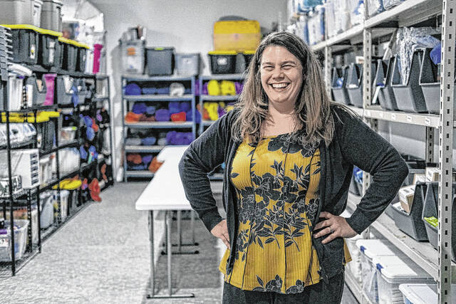 Pastor Amy Linnemann of Ohio Chapel United Methodist Church stands in her office at the nonprofit Beloved Bags outreach.