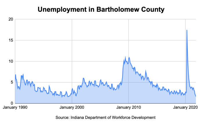 The last time Bartholomew County recorded an unemployment rate of 1.6% was May 1999 — when Bill Clinton was president and Frank O’Bannon was Indiana governor. The only other time local unemployment was as low as 1.6% was in April 1998.
