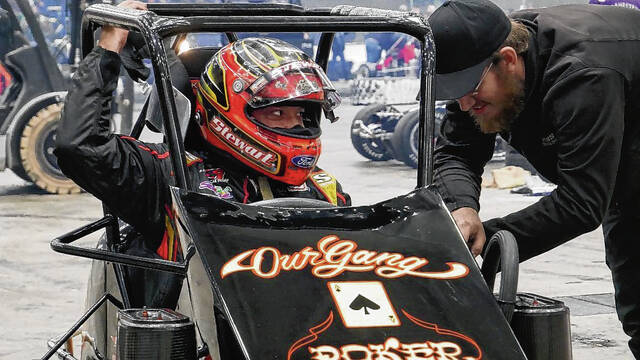 Tony Stewart talks with his crew chief Sam McGhee before going out and winning his 12th career Rumble in Fort Wayne for midget cars on Saturday.