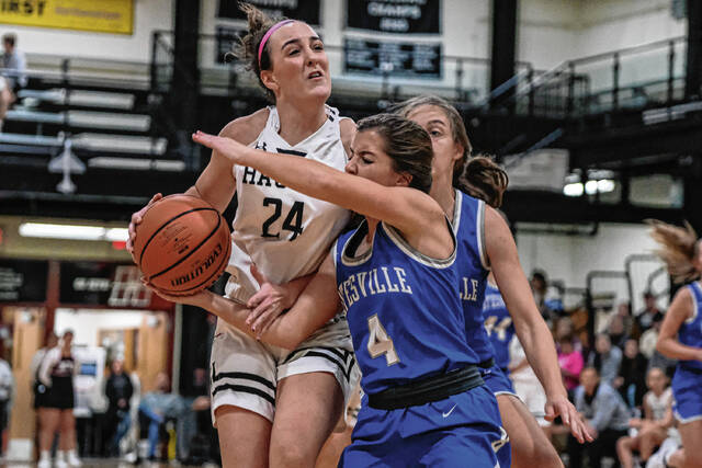 Batesville’s Emma Weiler, left, leaps to defend a shot by Hauser’s Madelyn Poe during a basketball game at Hauser Jr./Sr. High School in Hope, Ind., Friday, Nov. 5, 2021. Mike Wolanin | The Republic
