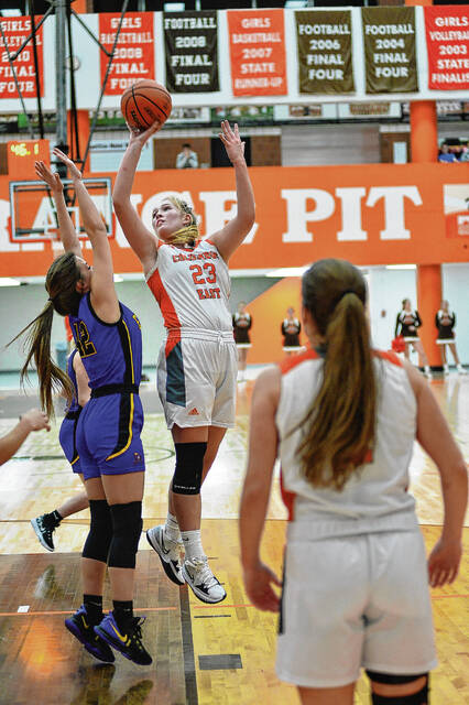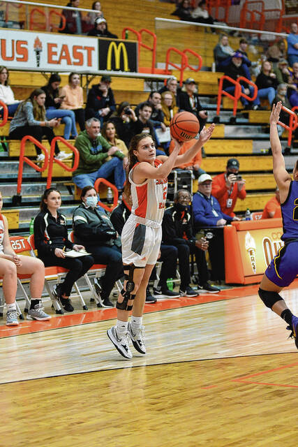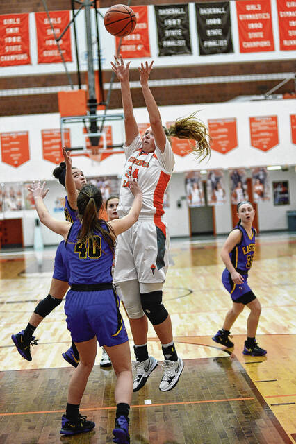 Koryn Greiwe breaks Columbus East’s girls basketball all-time scoring mark after draining this 3-point shot against Eastern in the third quarter in the Orange Pit at Columbus East High School.