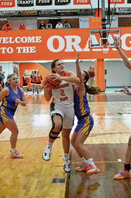 Columbus East’s Koryn Greiwe, right, attempts a shot while guarded by Zionsville’s Laila Hull during a basketball game at Columbus East High School in Columbus, Ind., Wednesday, Dec. 29, 2021.