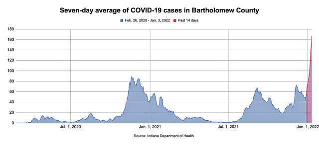Prior to the first confirmed omicron variant case in Indiana on Dec. 19, the highest seven-day average of new cases in Bartholomew County was 89 on Nov. 20, 2020, state records show.