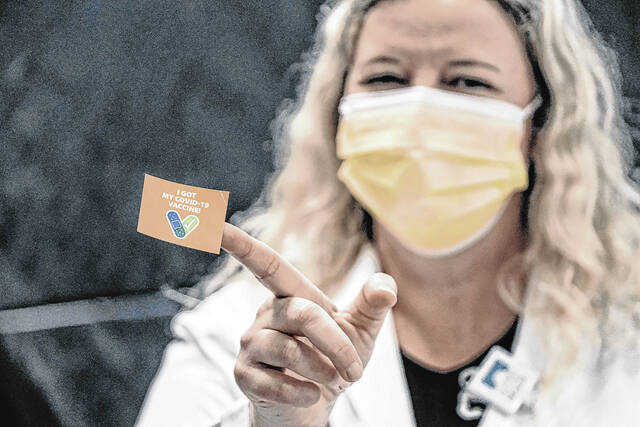 Mike Wolanin | The Republic Clinical Pharmacy Coordinator Chris Soedel shows the COVID-19 vaccine sticker she handed out to people who received the Pfizer-BioNTech COVID-19 vaccine at a Columbus Regional Health facility in Columbus, Ind., Thursday, Dec. 17, 2020.