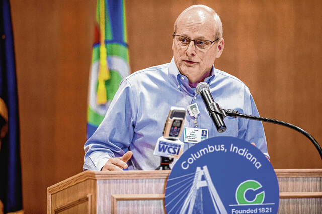Mike Wolanin | The Republic Columbus Regional Health President and CEO Jim Bickel talks about recommendations by the Columbus and Bartholomew County COVID-19 Community Task Force during a press conference at Columbus City Hall in Columbus, Ind., Friday, March 13, 2020.
