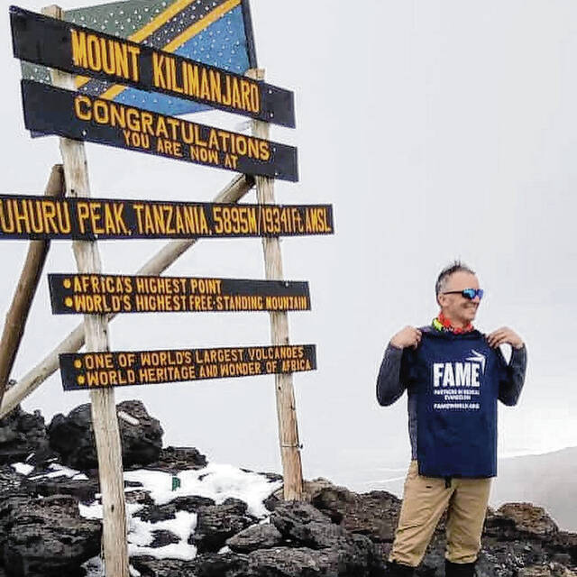 So Yeaton’s climb can bring healthful hope to as many as 10,000 Kenyans per year, according to FAME’s advance estimates. No wonder that a picture from Facebook shows him beaming at the summit — holding a FAME T-shirt. His brother, Pastor Steve Yeaton of First Christian Church, is impressed.
