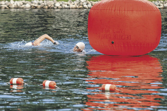 Swimmers round a buoy during the Columbus Challenge Triathlon at Tipton Lakes Marina in Columbus, Ind., Saturday, Aug. 4, 2018.