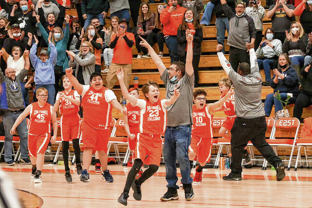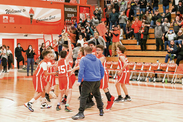 CSA Fodrea’s bench comes off the floor in celebration after winning the BCSC EBL boys championship game held at Columbus East Feb. 5, 2022.