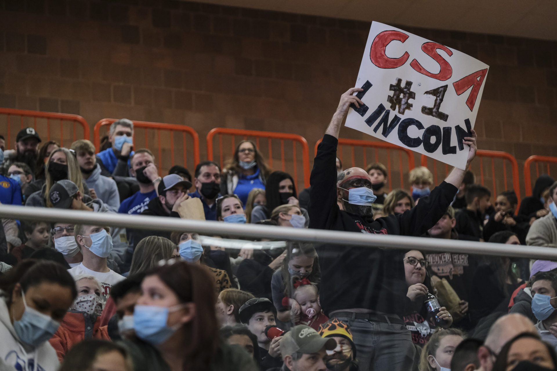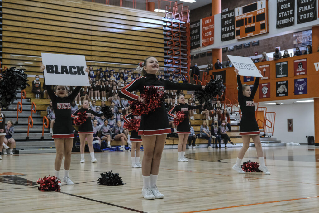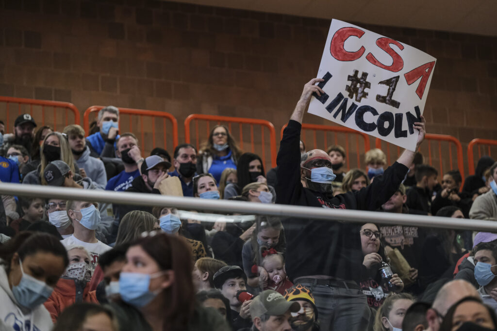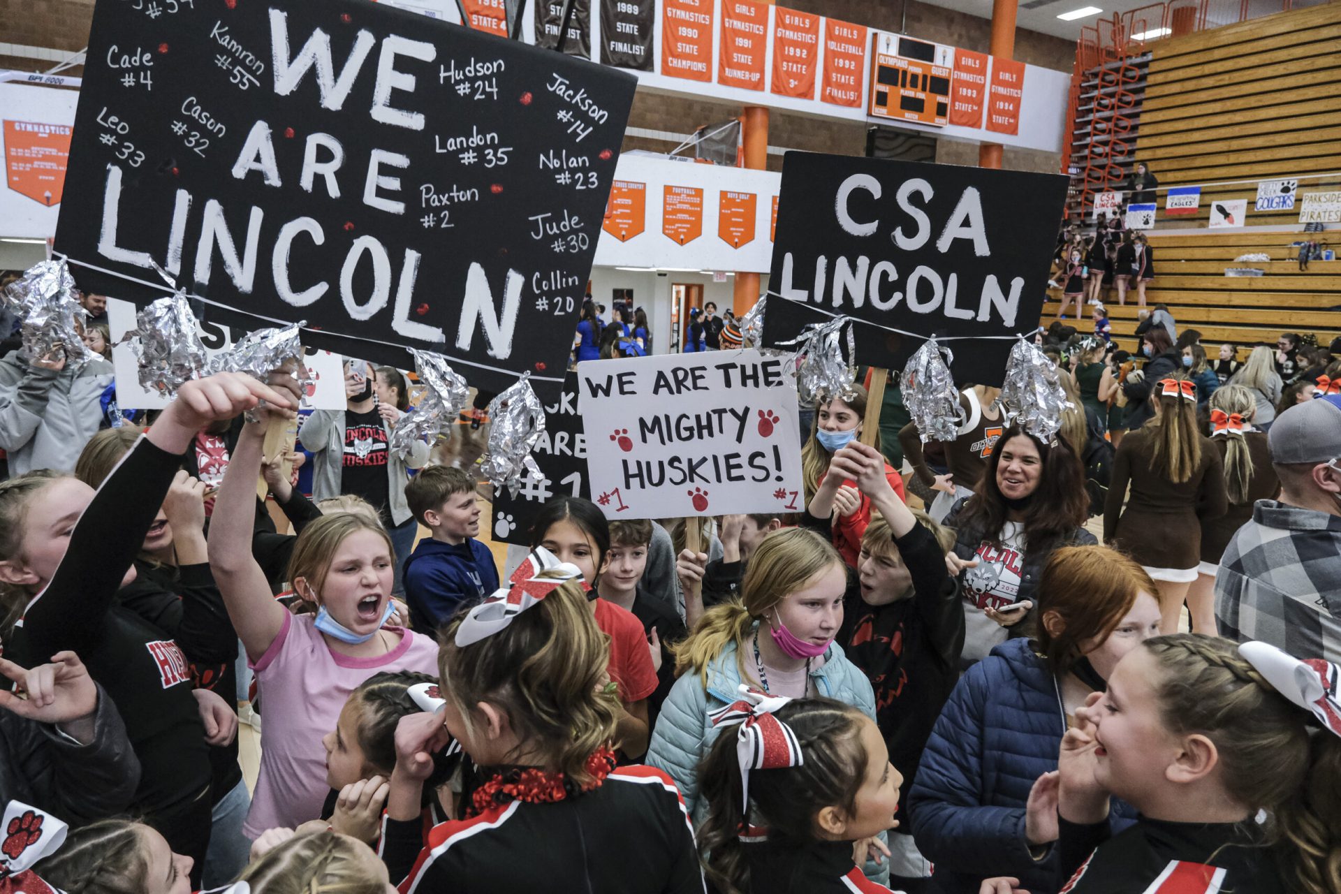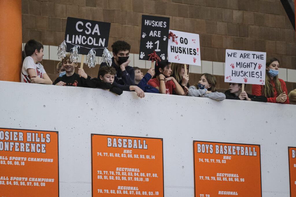 CSA Lincoln fans show support for their school as they await the results of the EBL Super Saturday Cheer Day competition at Columbus East High School in Columbus, Ind., Saturday, Feb. 5, 2022. The CSA Lincoln Huskies cheerleading squad won first place. Mike Wolanin | The Republic