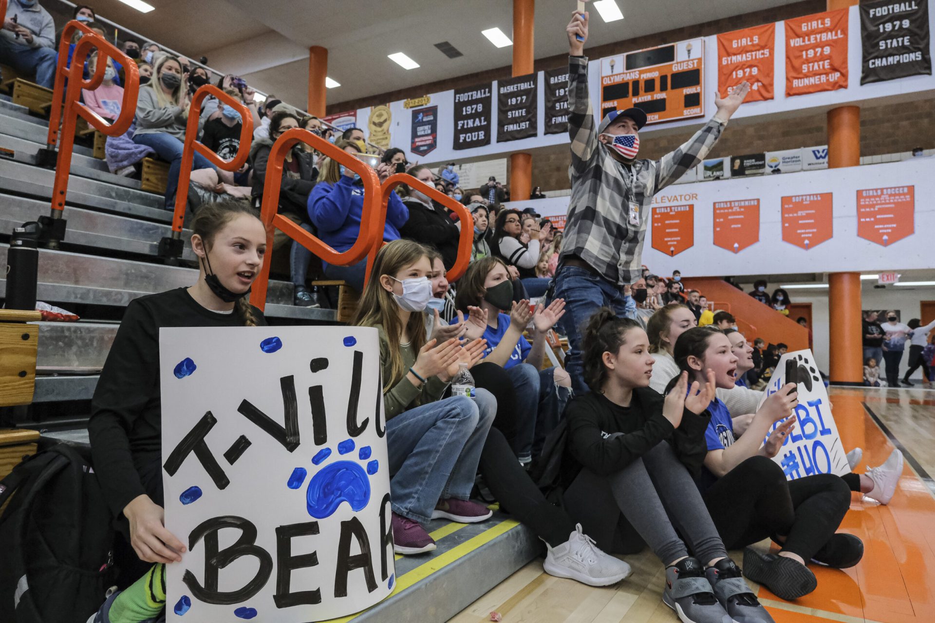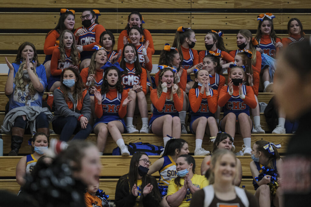 Fans reacts after the Taylorsville Bears cheerleaders performance during the EBL Super Saturday Cheer Day competition at Columbus East High School in Columbus, Ind., Saturday, Feb. 5, 2022. Mike Wolanin | The Republic