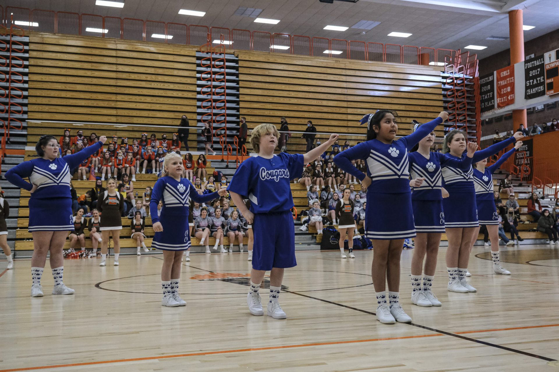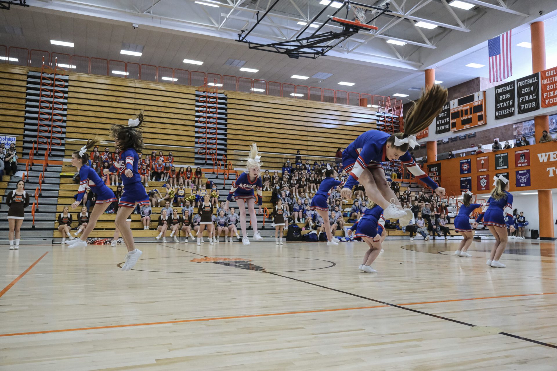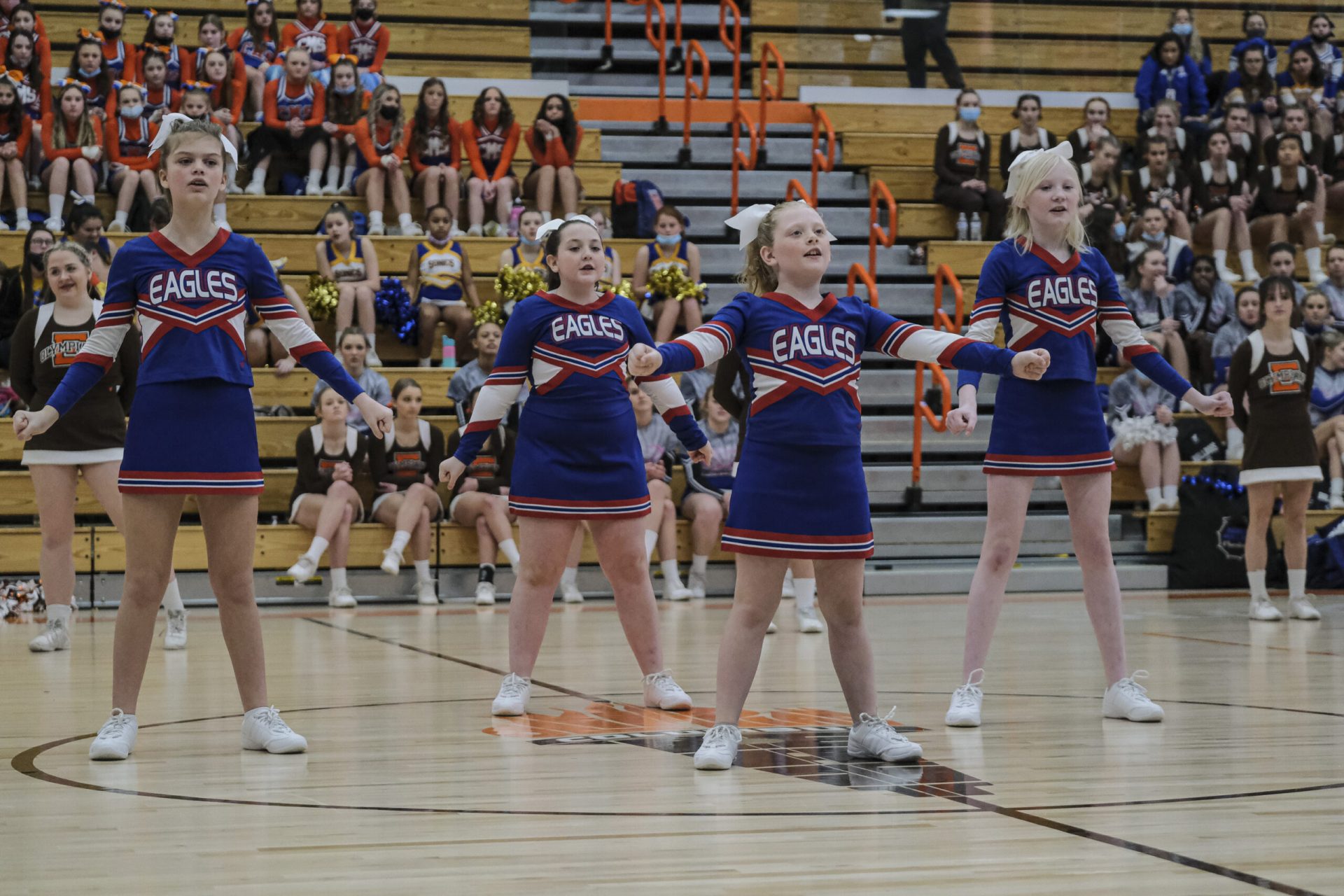 Columbus East High School cheerleaders take the floor for an exhibition performance during the EBL Super Saturday Cheer Day competition at Columbus East High School in Columbus, Ind., Saturday, Feb. 5, 2022. Mike Wolanin | The Republic