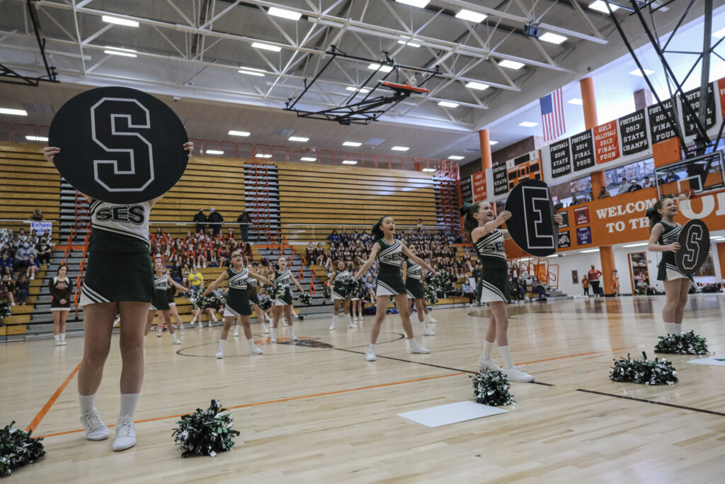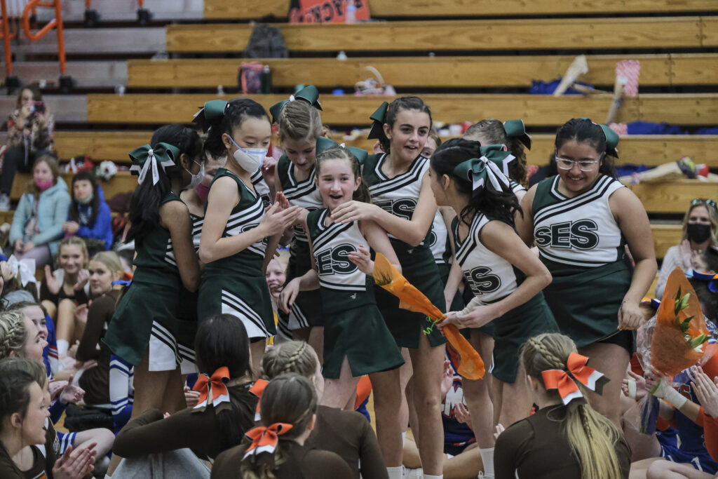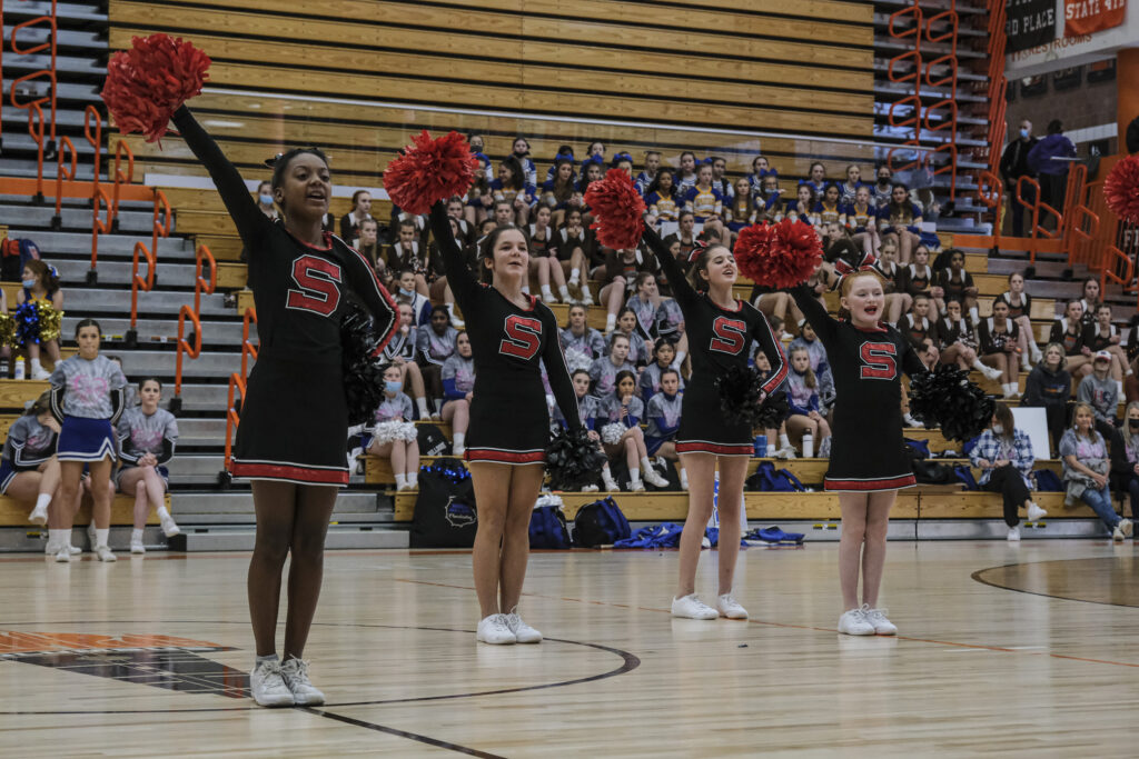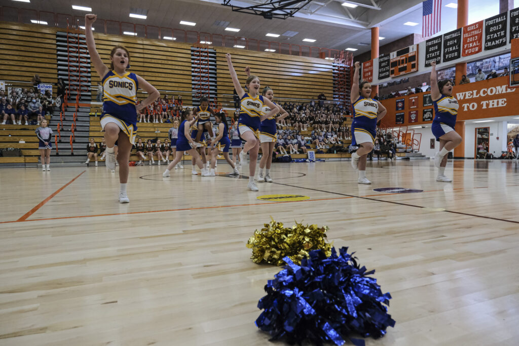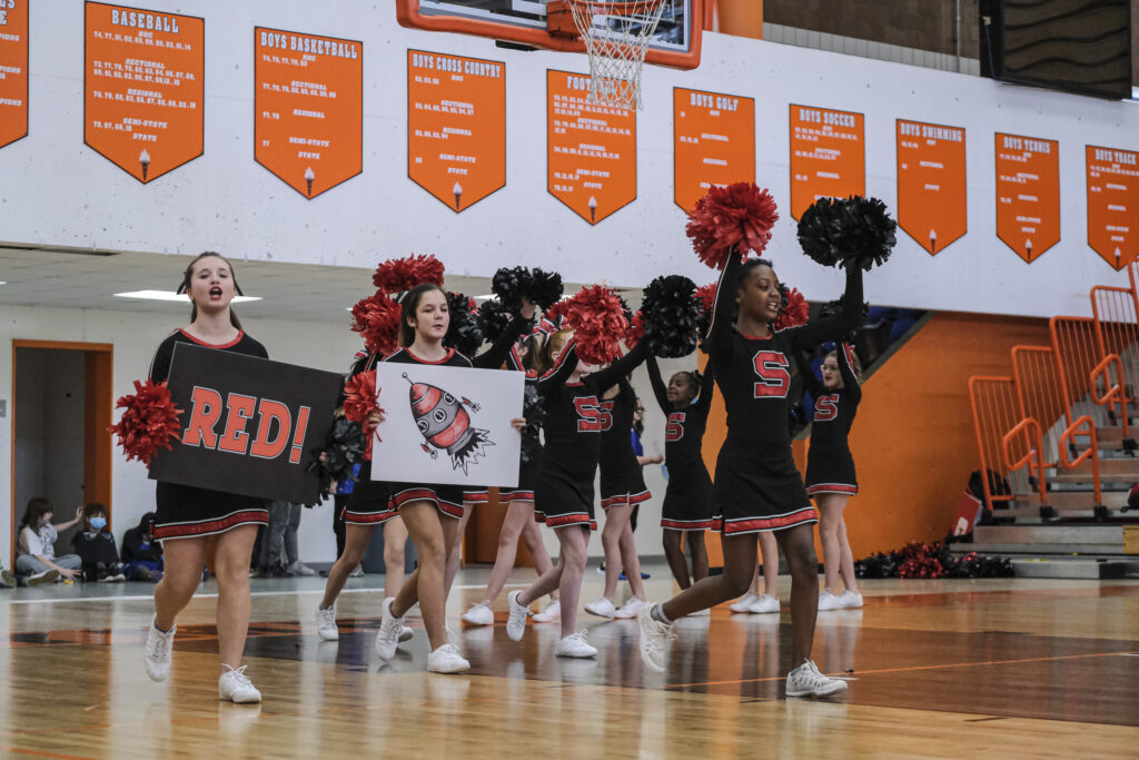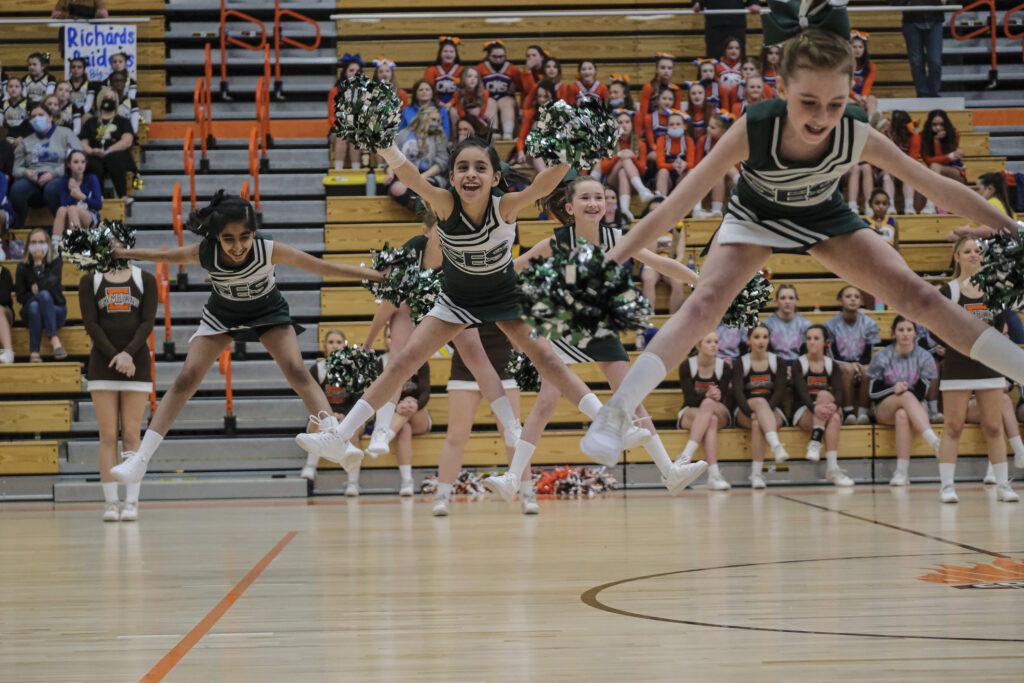 Schmitt Rocket cheerleaders take the floor to perform during the EBL Super Saturday Cheer Day competition at Columbus East High School in Columbus, Ind., Saturday, Feb. 5, 2022. Mike Wolanin | The Republic