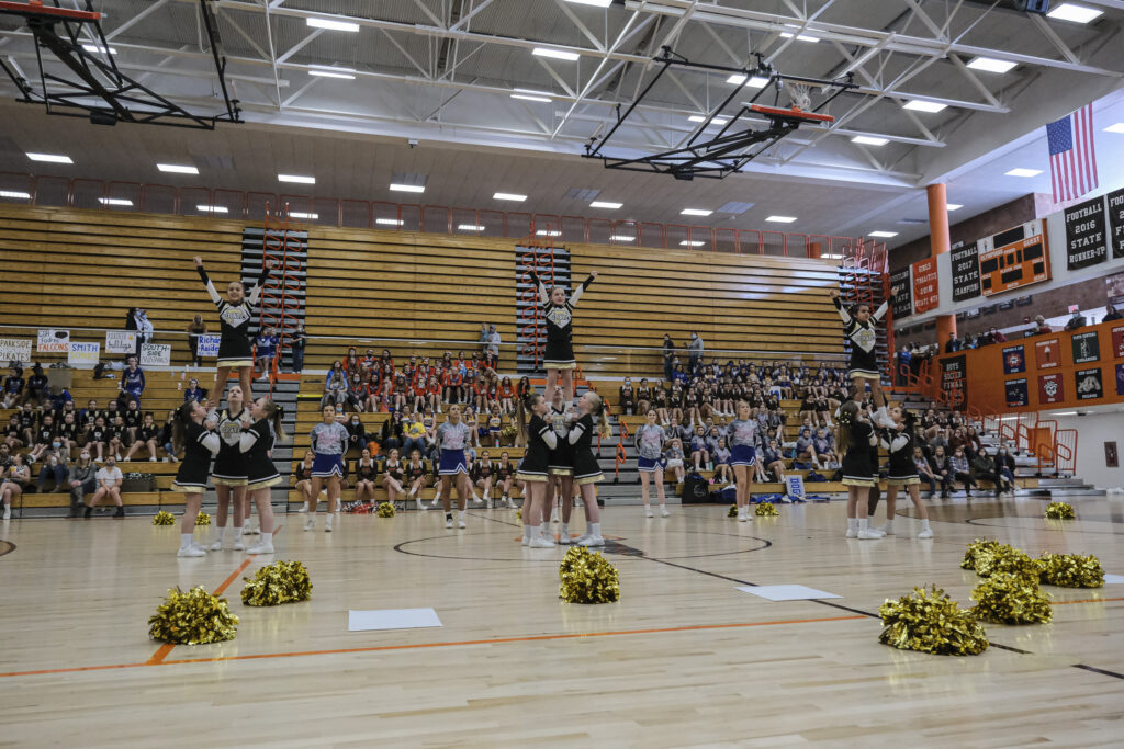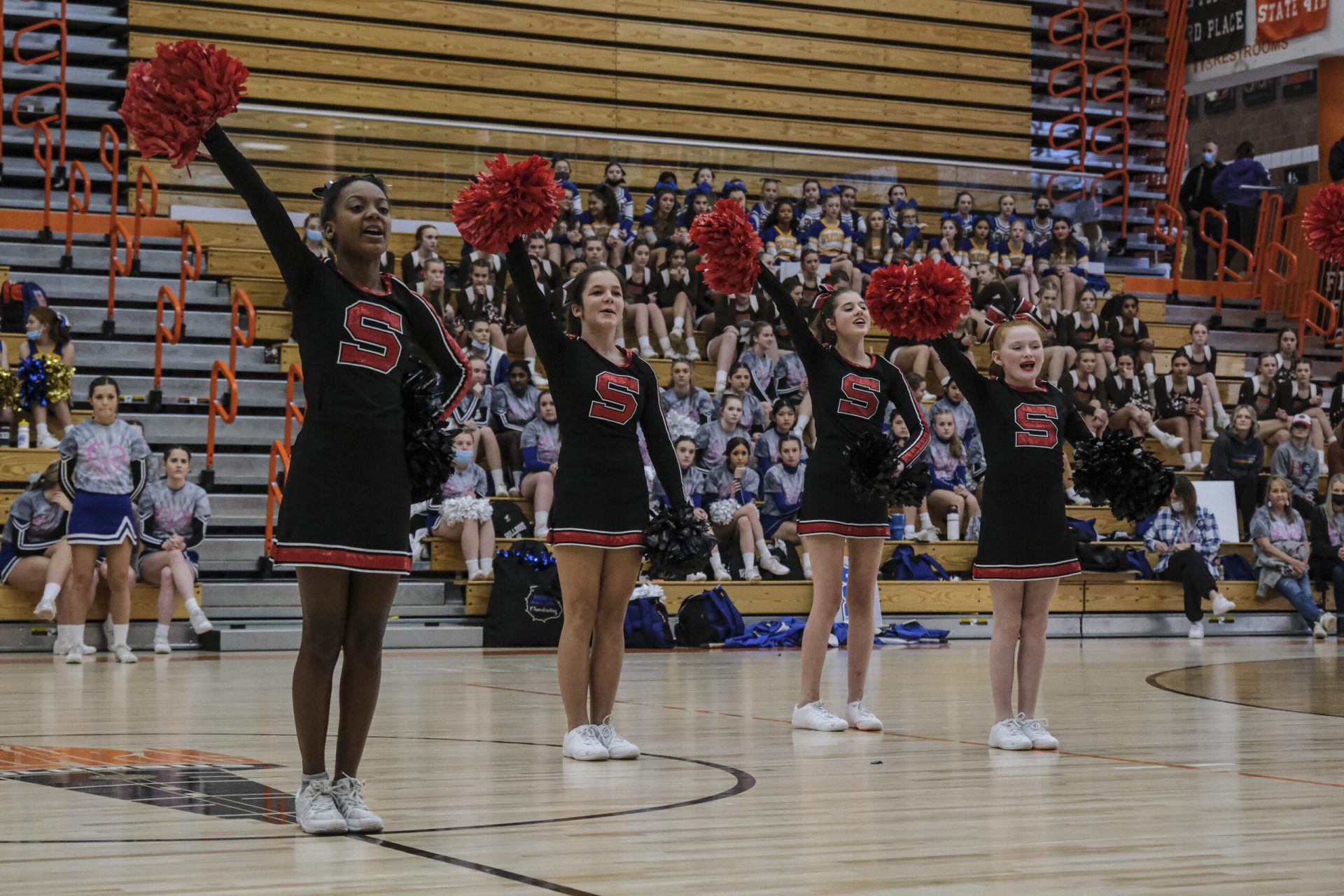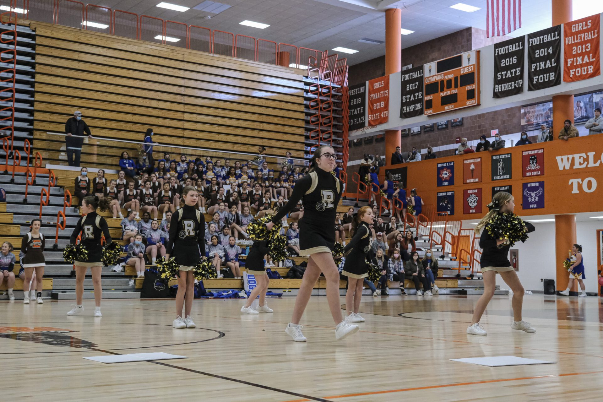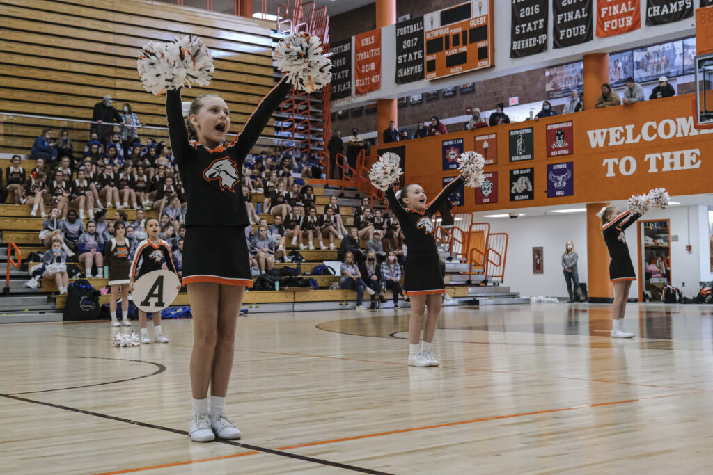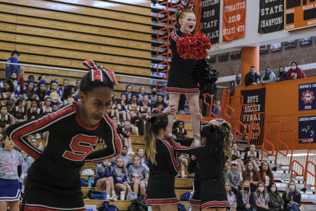 Schmitt Rocket cheerleaders take the floor to perform during the EBL Super Saturday Cheer Day competition at Columbus East High School in Columbus, Ind., Saturday, Feb. 5, 2022. Mike Wolanin | The Republic