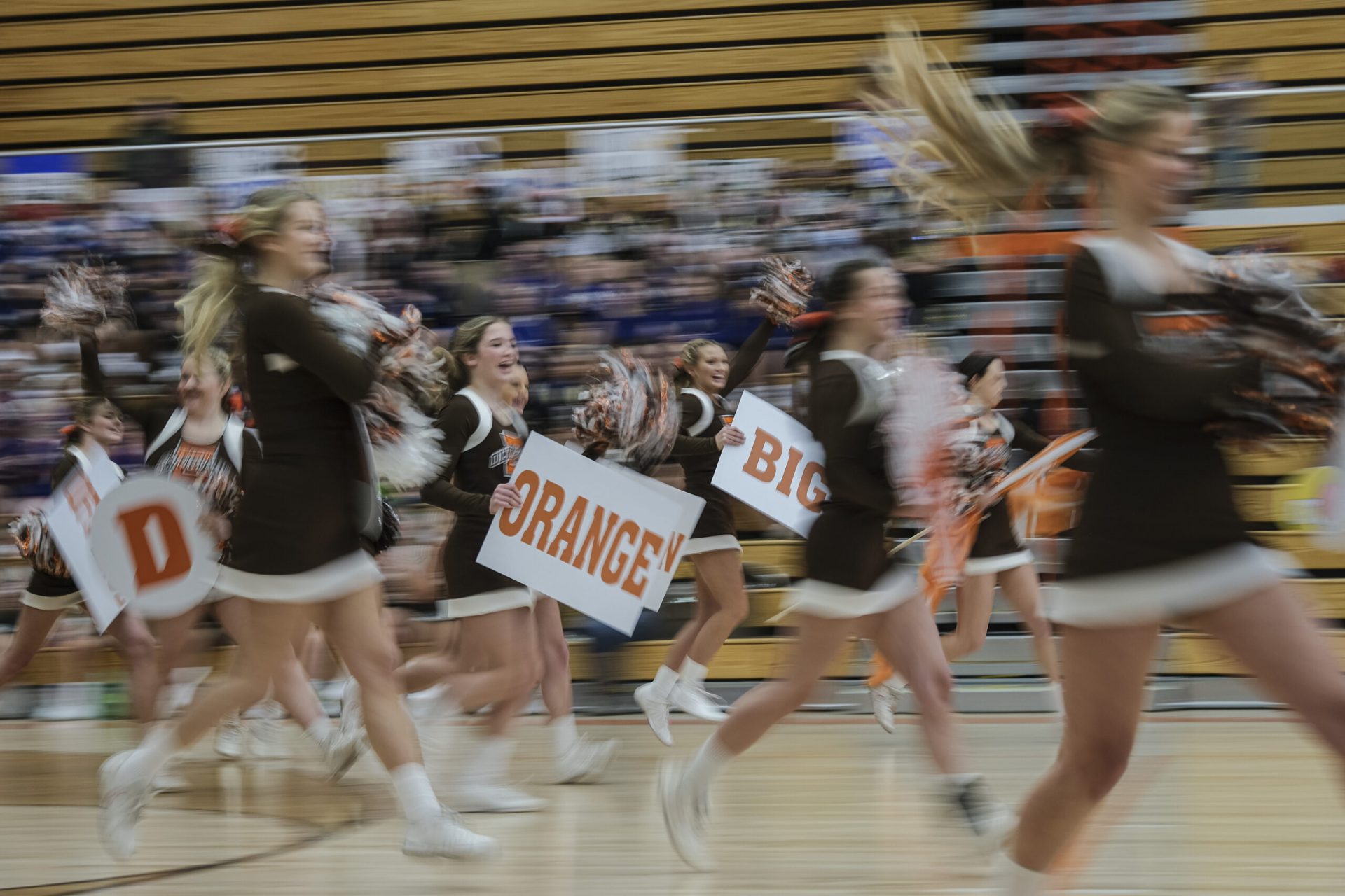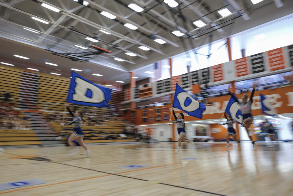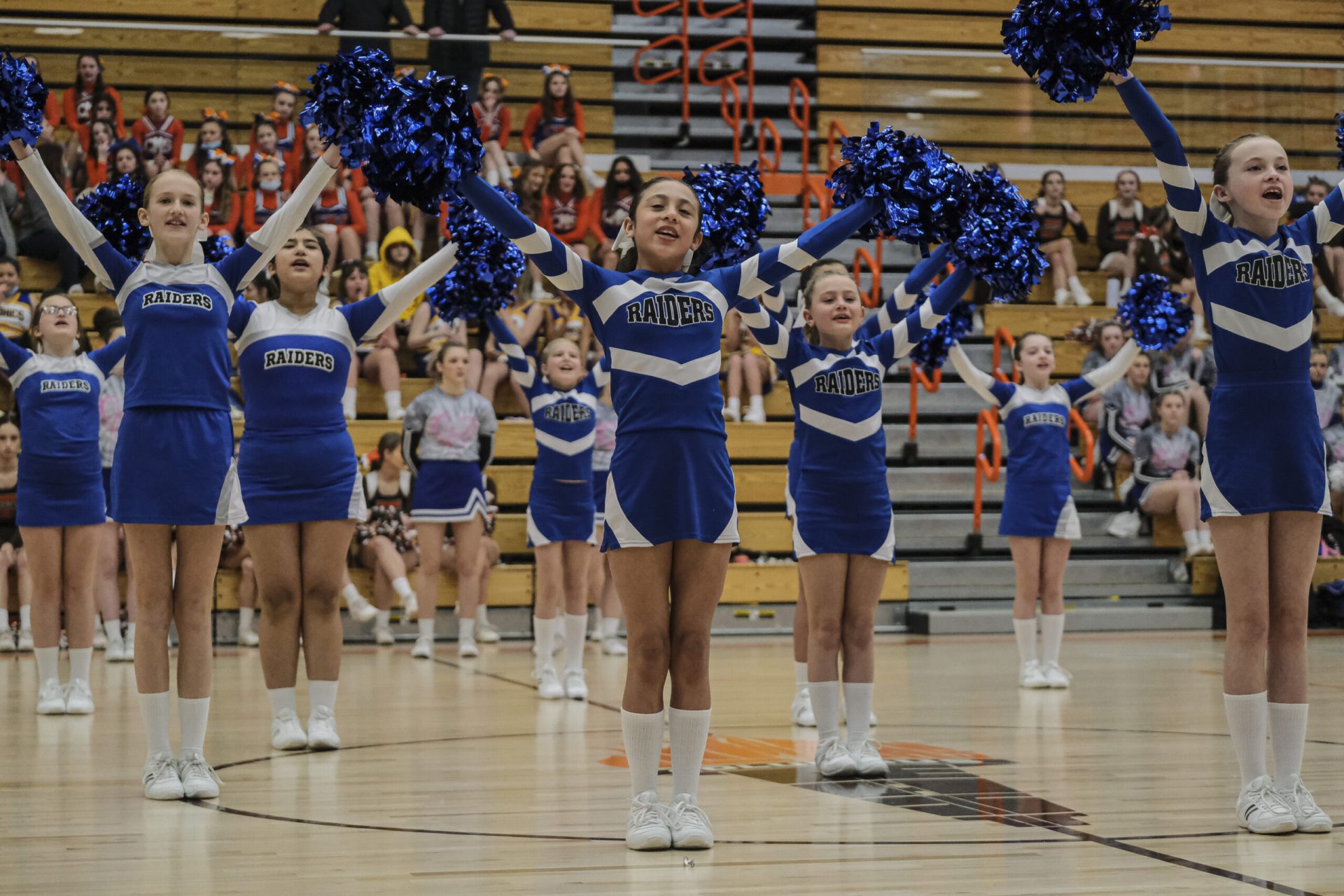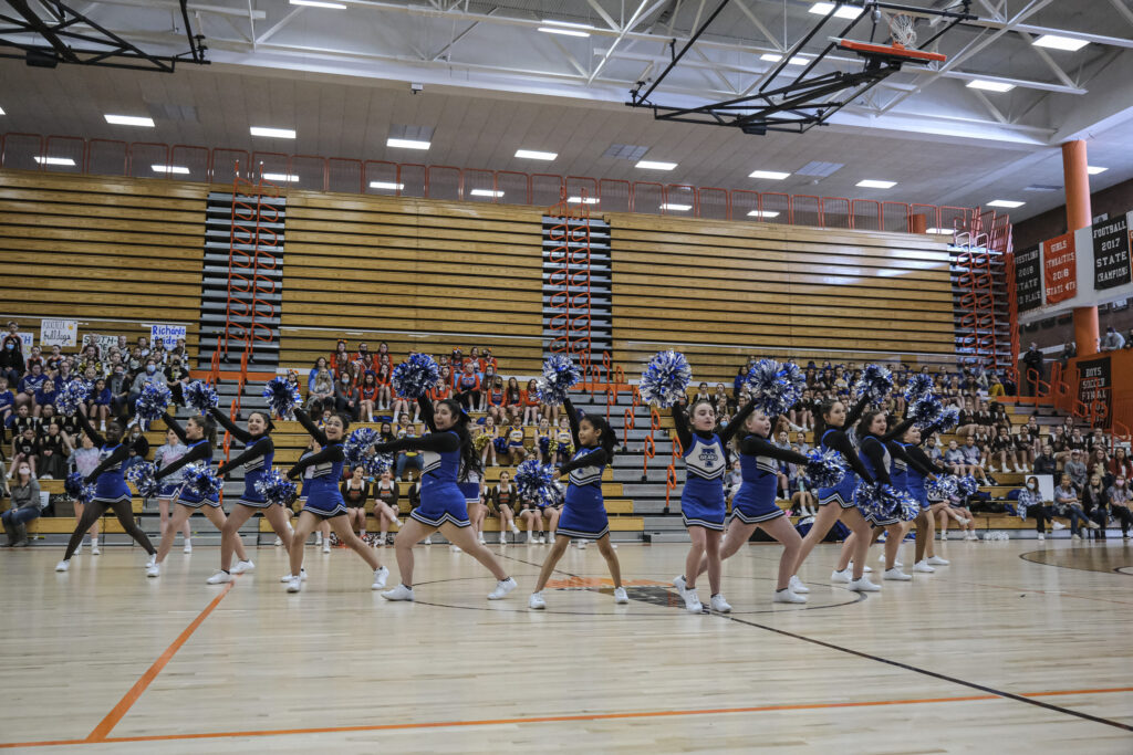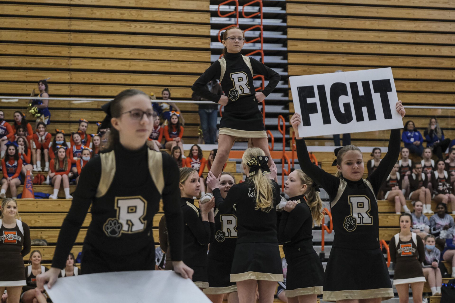 Schmitt Rocket cheerleaders take the floor to perform during the EBL Super Saturday Cheer Day competition at Columbus East High School in Columbus, Ind., Saturday, Feb. 5, 2022. Mike Wolanin | The Republic