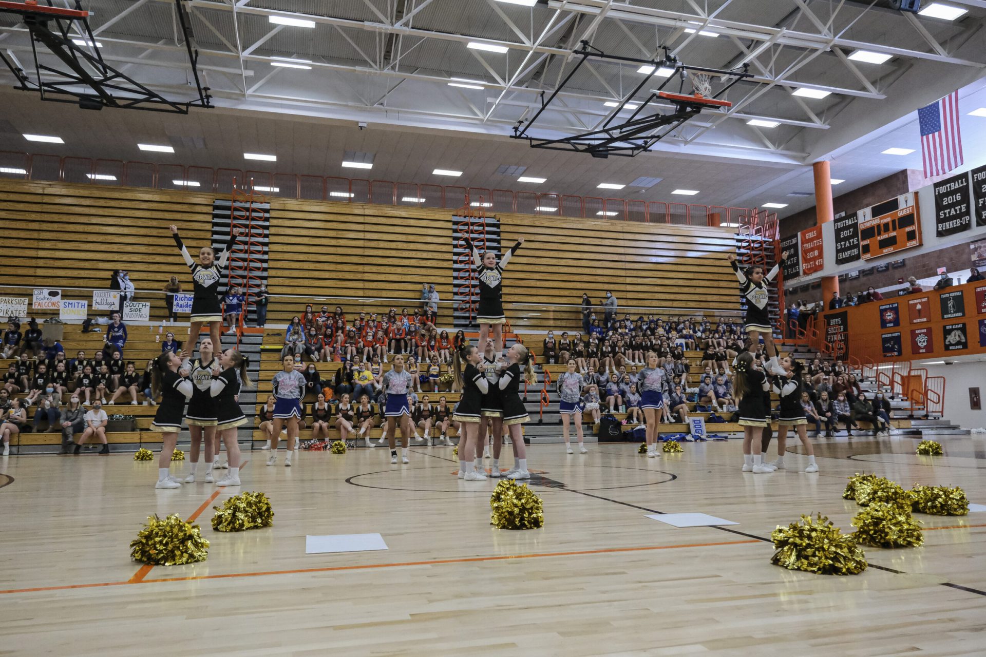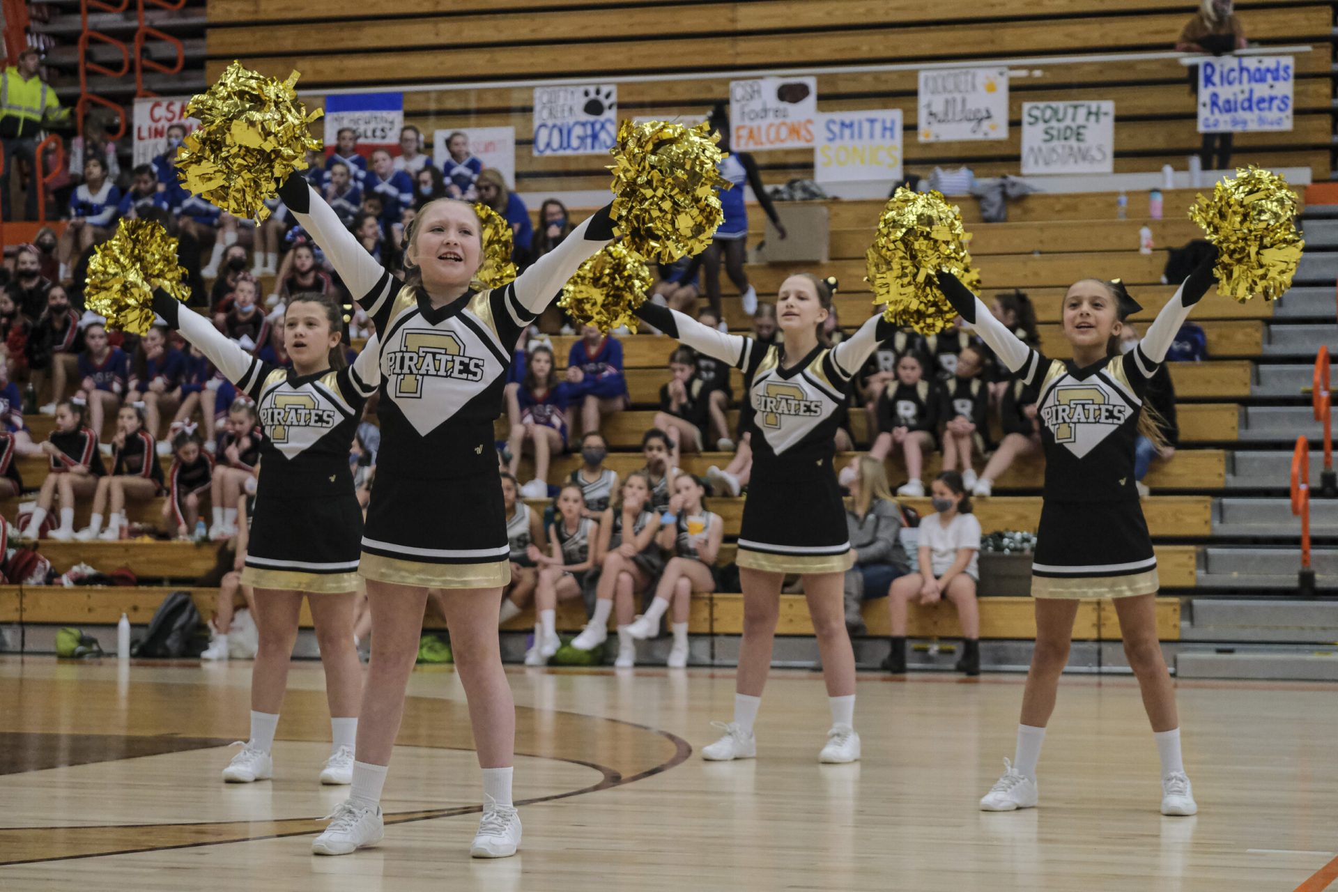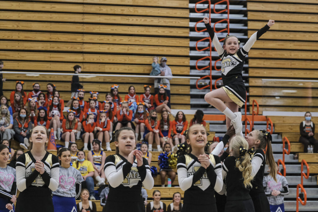 Parkside Pirates cheerleaders perform during the EBL Super Saturday Cheer Day competition at Columbus East High School in Columbus, Ind., Saturday, Feb. 5, 2022. Mike Wolanin | The Republic