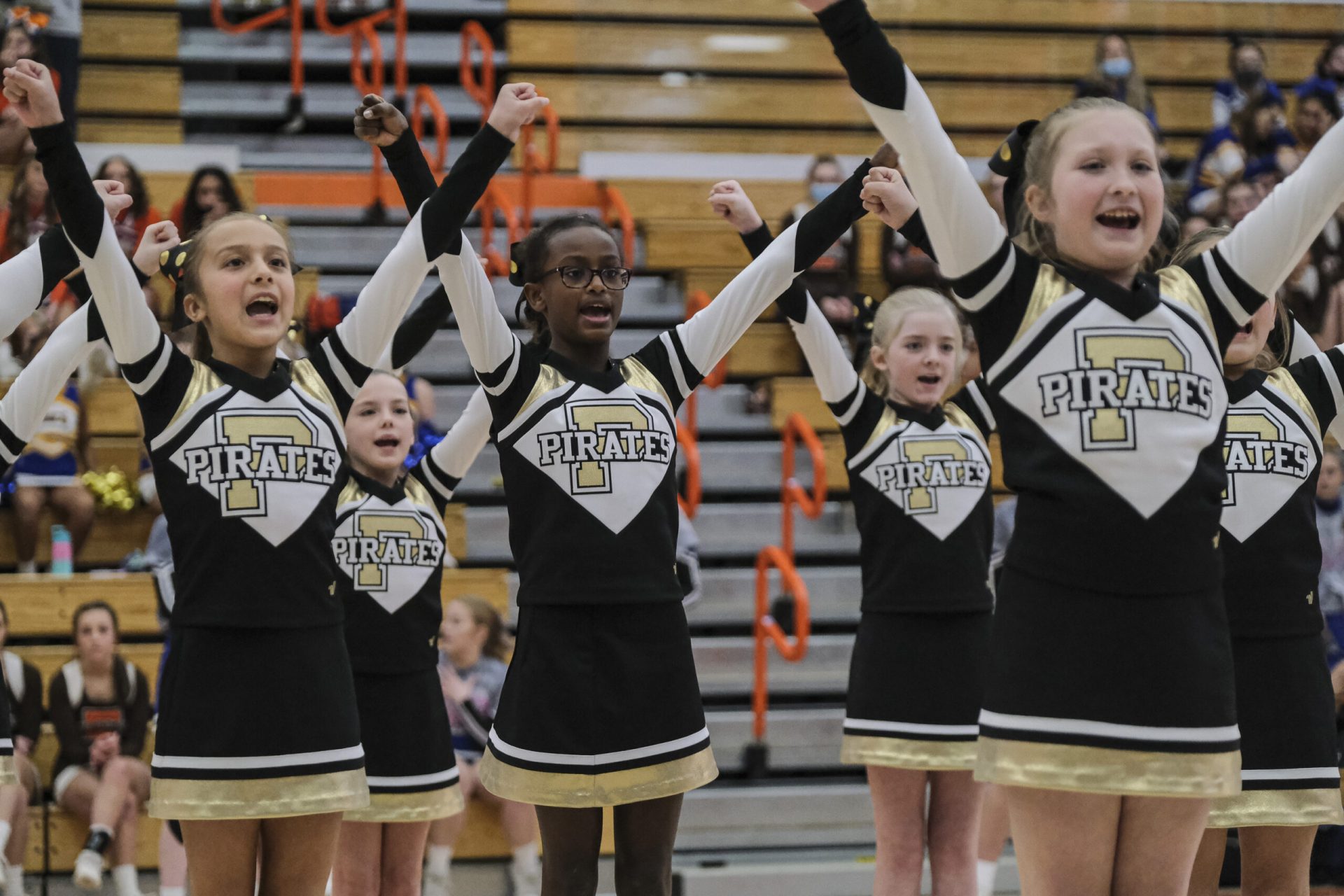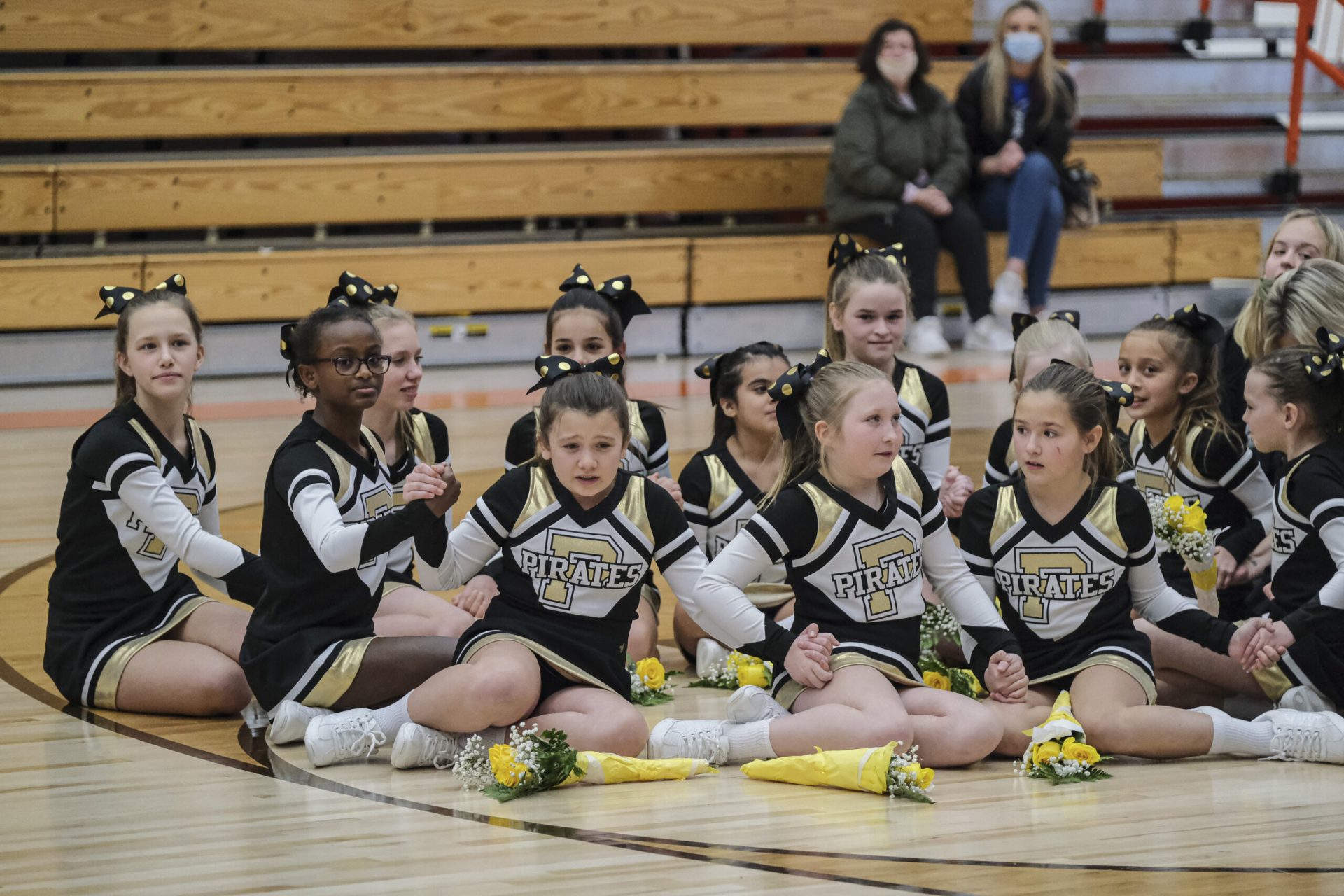 Parkside Pirates cheerleaders hold hands as they await the results of the EBL Super Saturday Cheer Day competition at Columbus East High School in Columbus, Ind., Saturday, Feb. 5, 2022. Mike Wolanin | The Republic