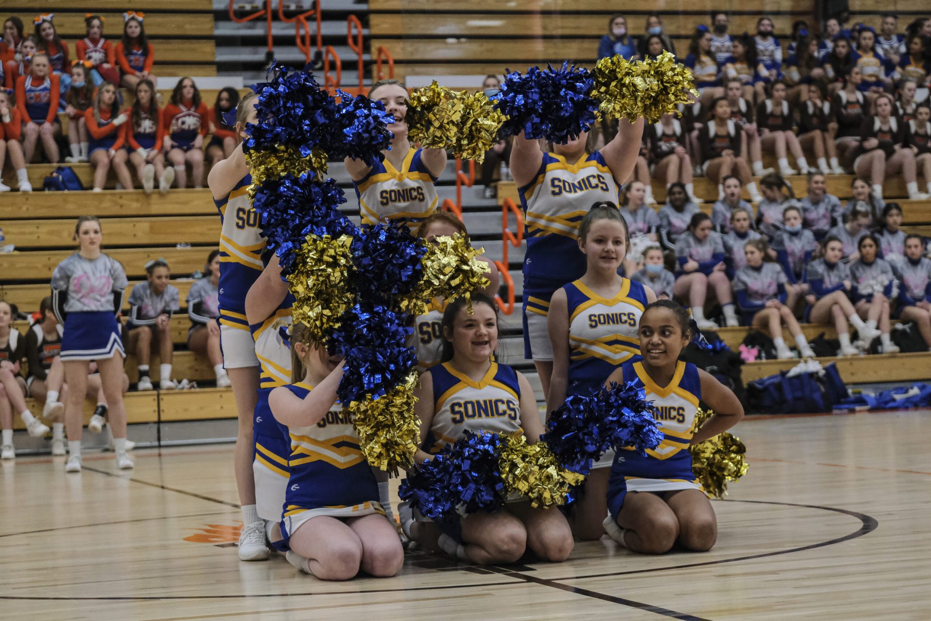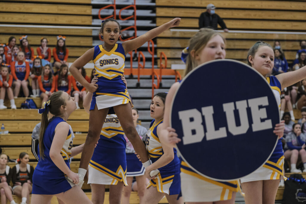 Smith Sonics cheerleaders perform during the EBL Super Saturday Cheer Day competition at Columbus East High School in Columbus, Ind., Saturday, Feb. 5, 2022. Mike Wolanin | The Republic