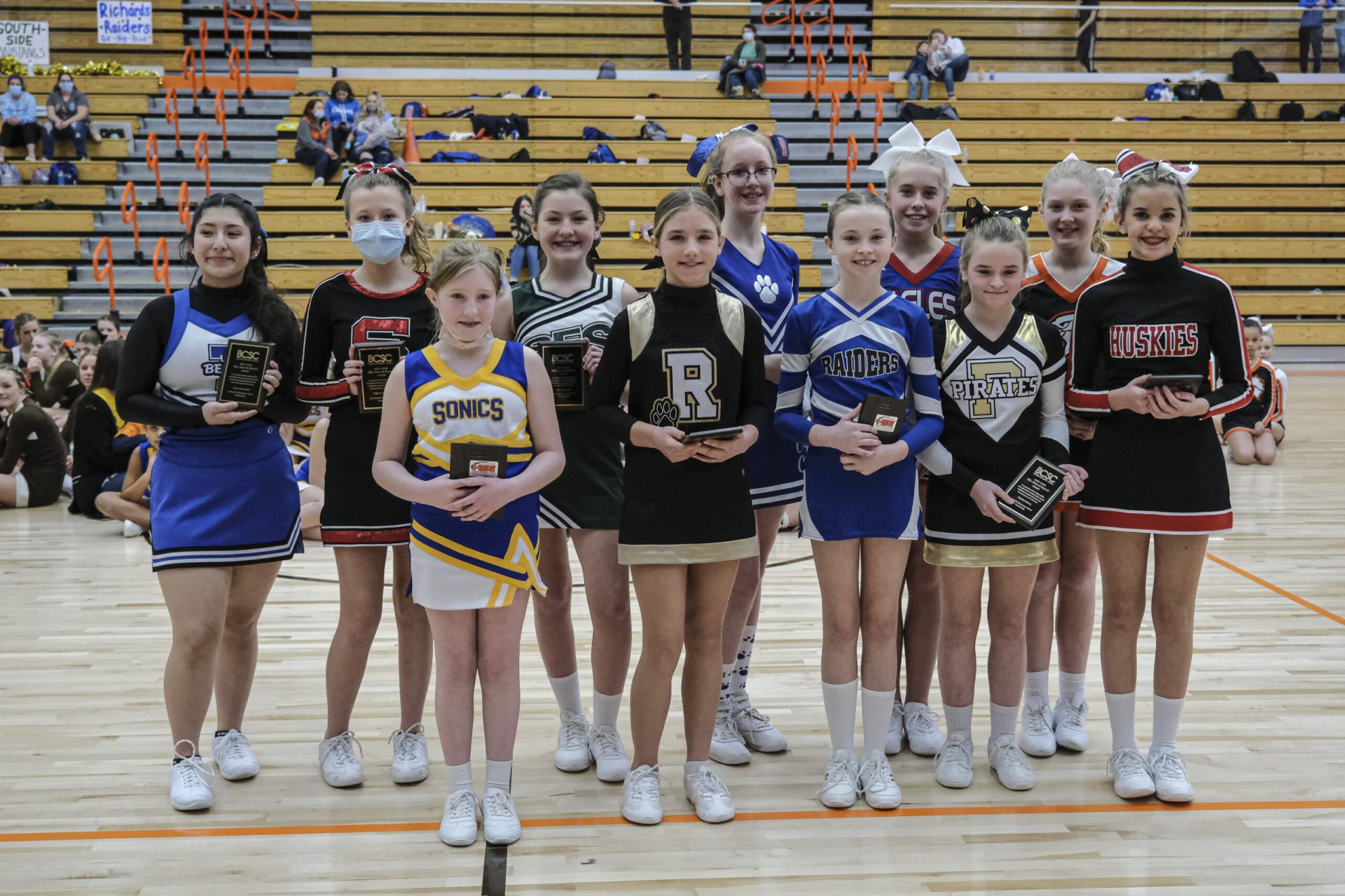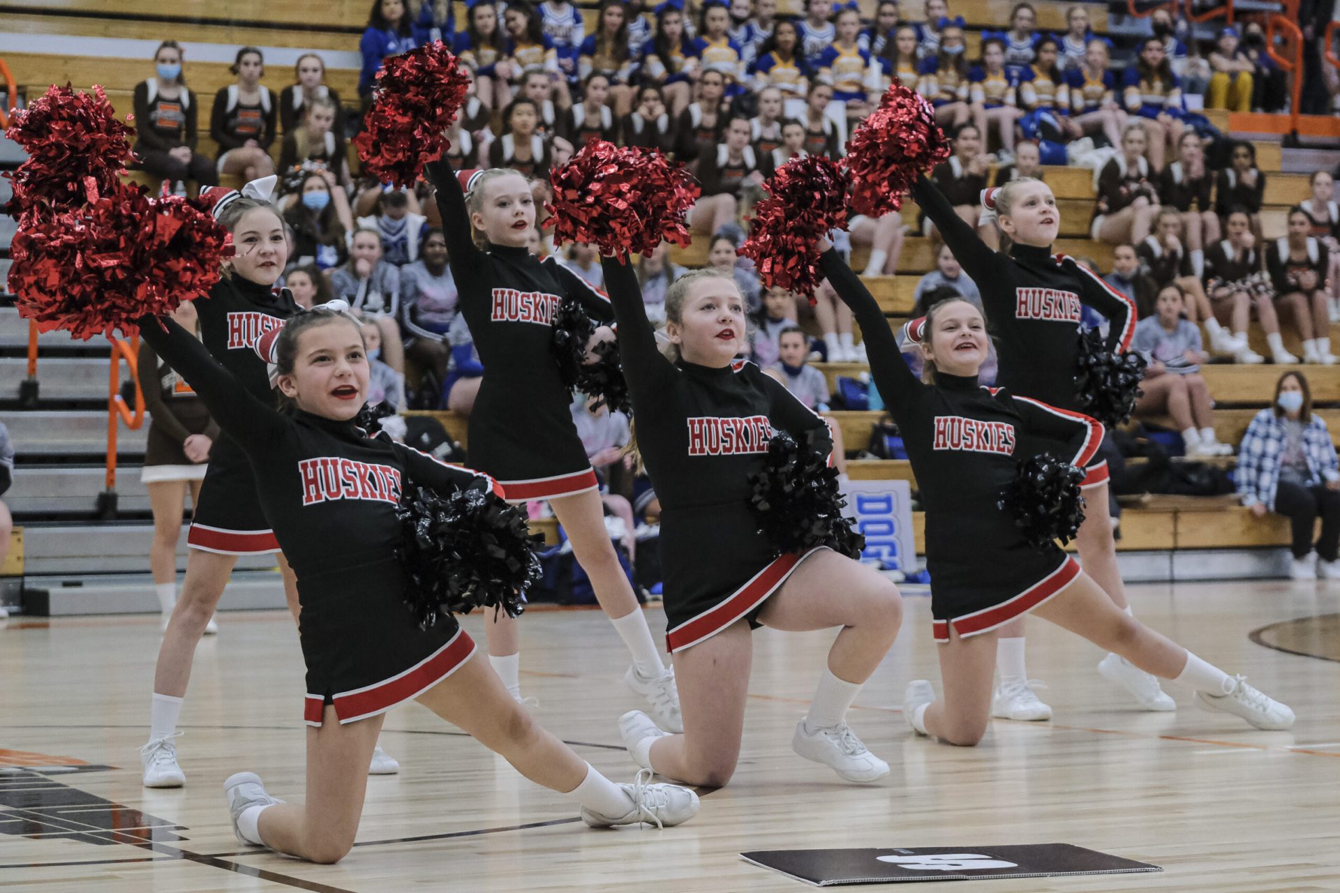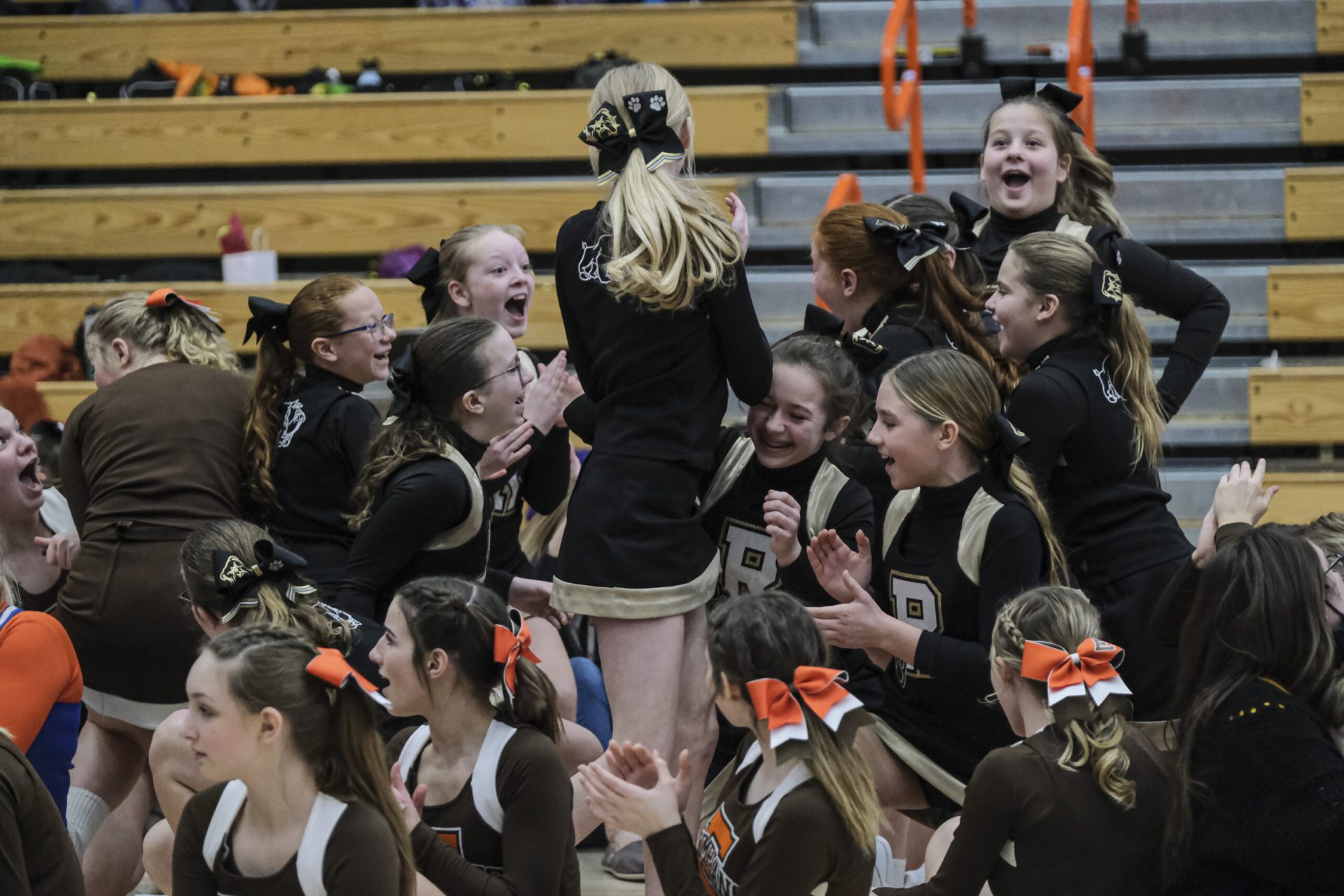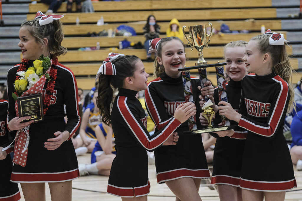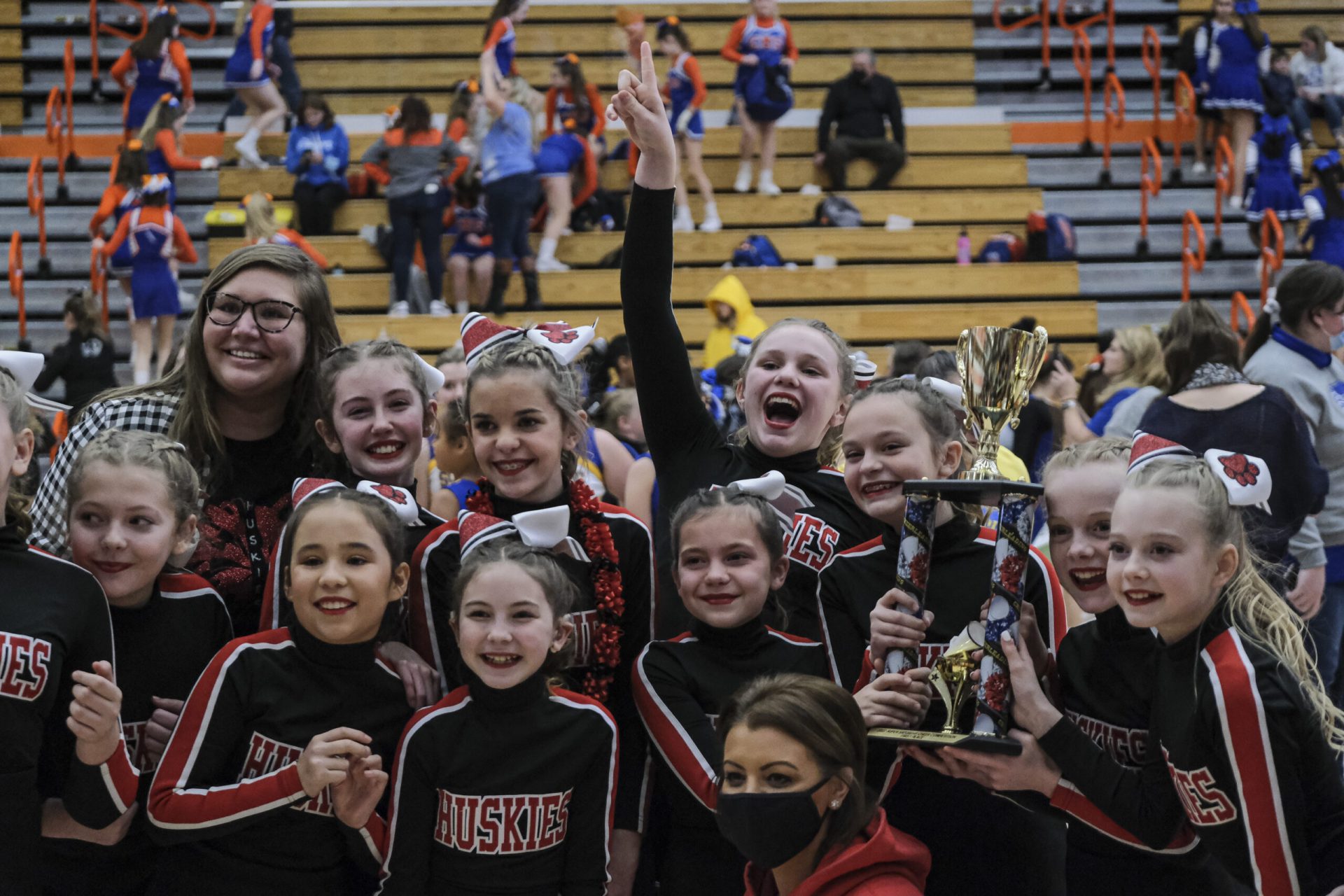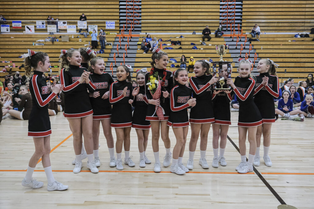 CSA Lincoln Huskies cheerleaders and Central Middle School cheerleaders react after the Huskies were announced as the winner of the EBL Super Saturday Cheer Day competition at Columbus East High School in Columbus, Ind., Saturday, Feb. 5, 2022. Mike Wolanin | The Republic