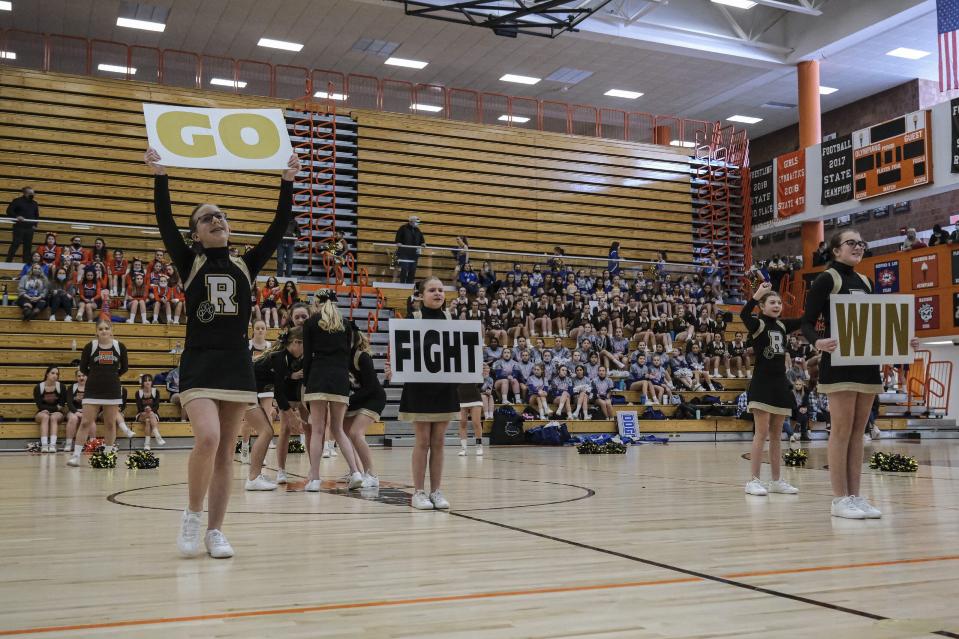 Rockcreek Bulldogs cheerleaders reacts after winning second place in the EBL Super Saturday Cheer Day competition at Columbus East High School in Columbus, Ind., Saturday, Feb. 5, 2022. Mike Wolanin | The Republic