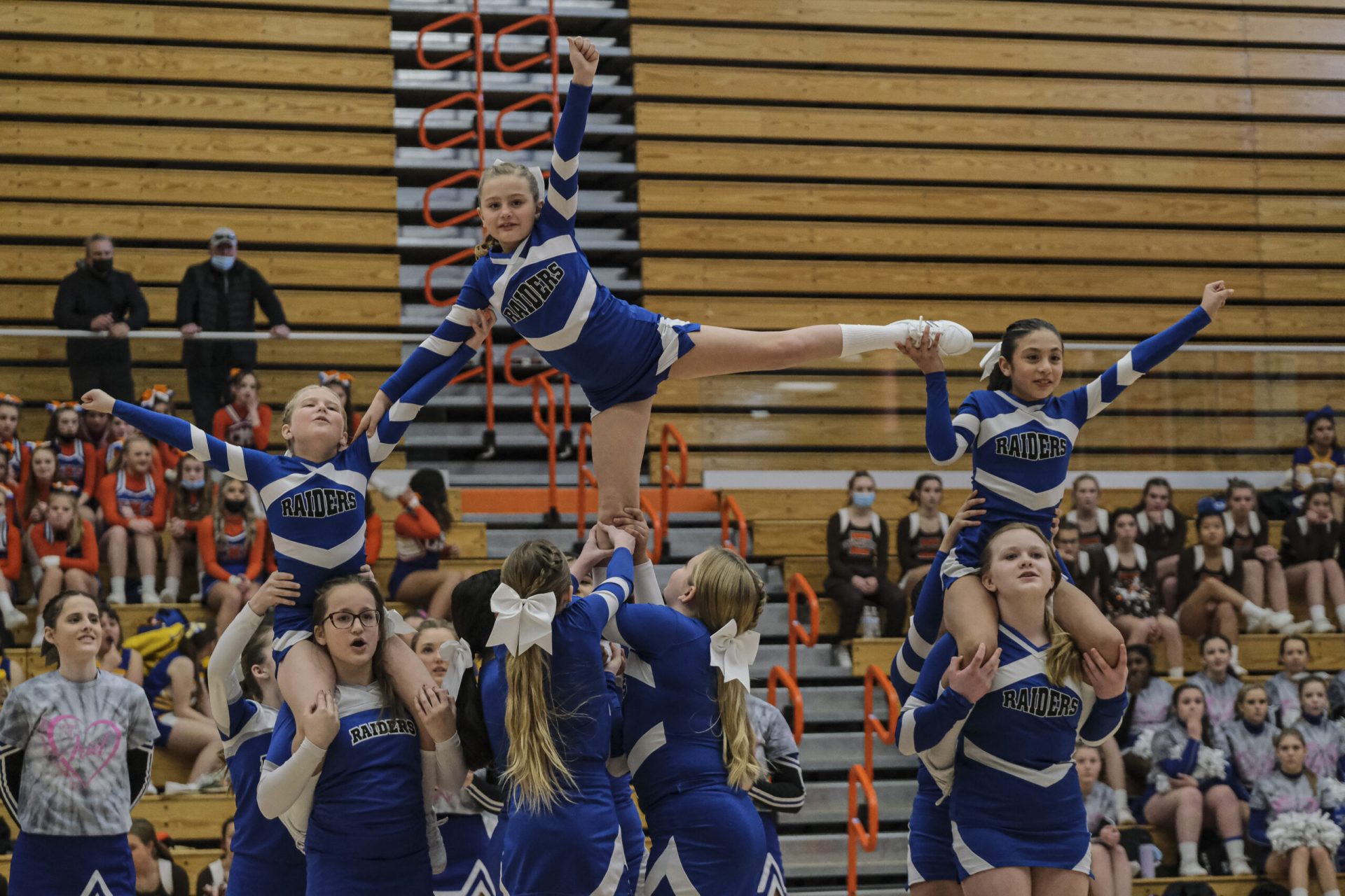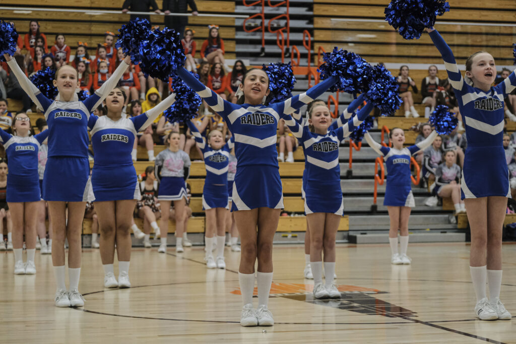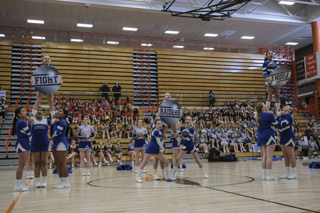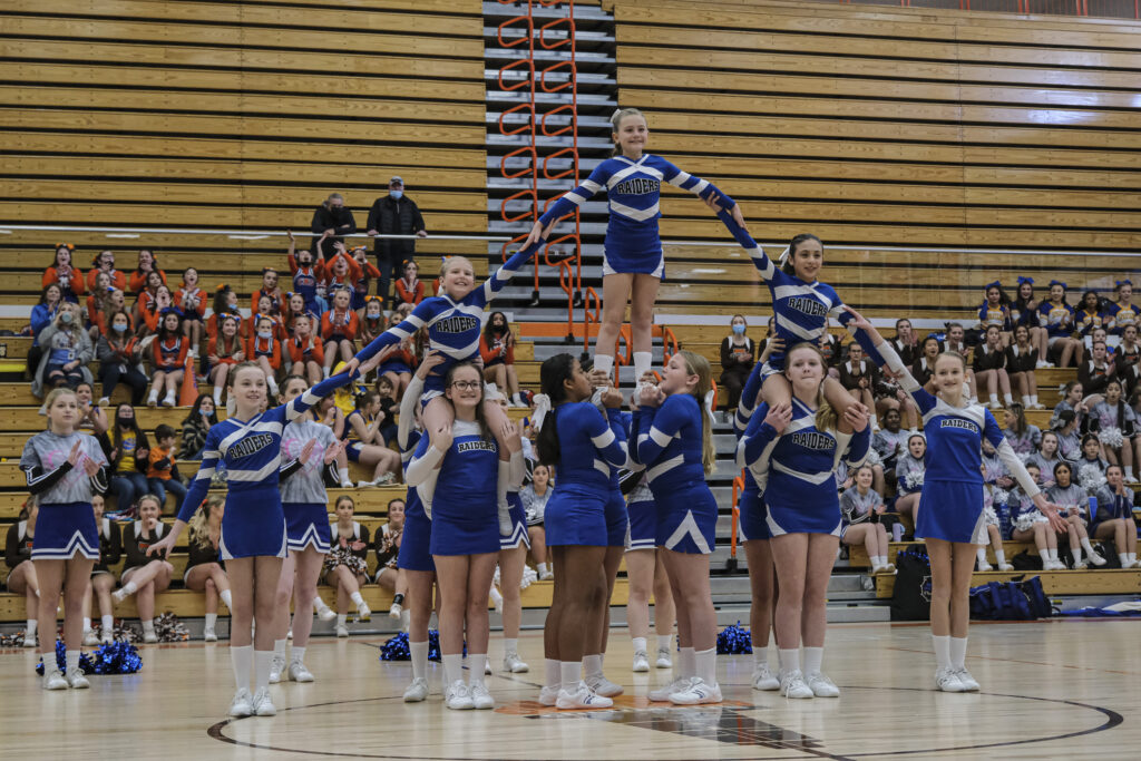Richards Raiders cheerleaders perform during the EBL Super Saturday Cheer Day competition at Columbus East High School in Columbus, Ind., Saturday, Feb. 5, 2022. Mike Wolanin | The Republic