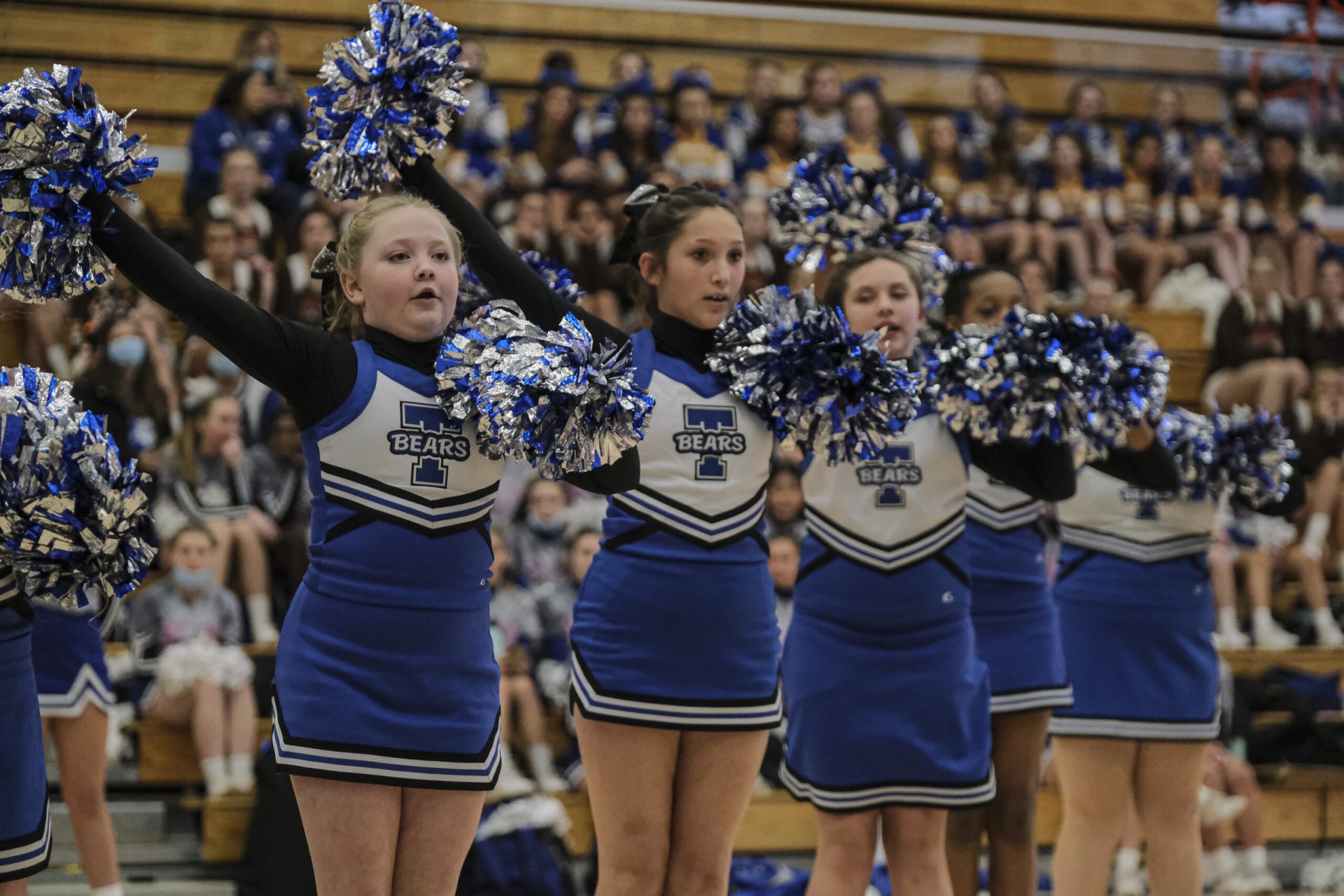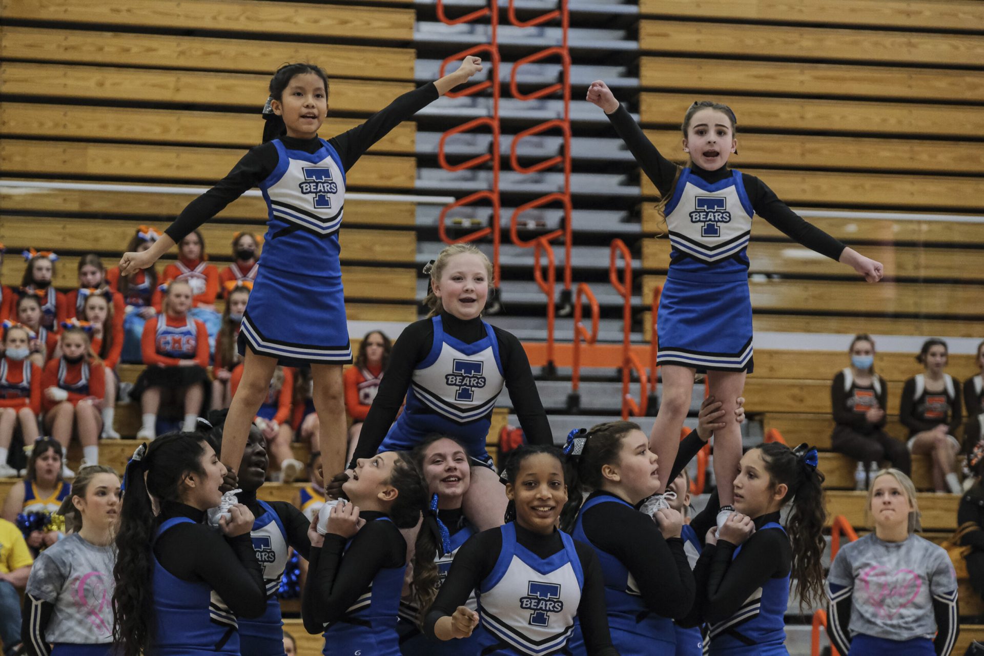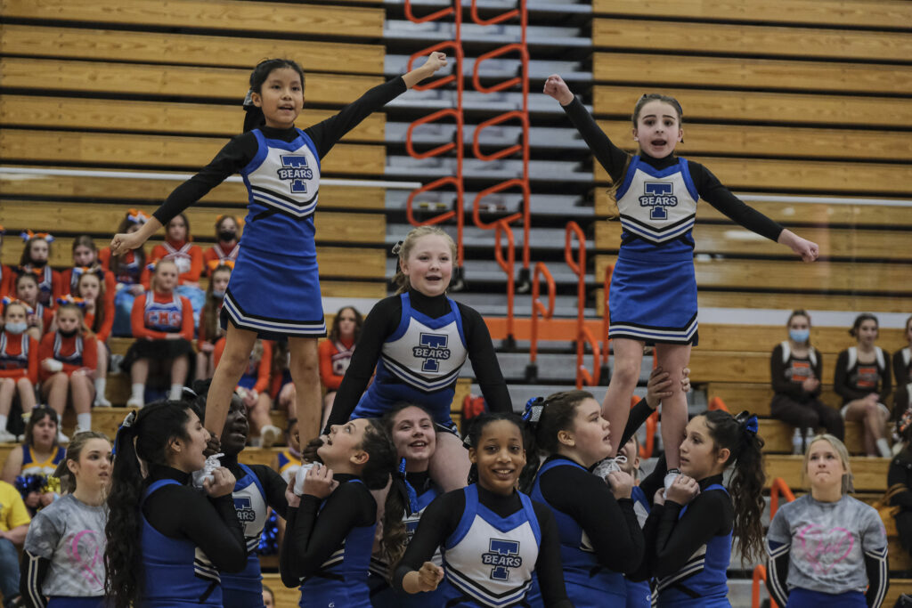 The Taylorsville Bears cheerleaders perform during the EBL Super Saturday Cheer Day competition at Columbus East High School in Columbus, Ind., Saturday, Feb. 5, 2022. Mike Wolanin | The Republic