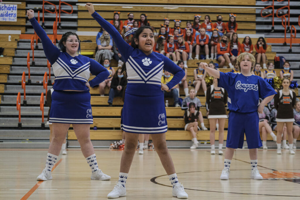 Clifty Creek Cougars cheerleaders perform during the EBL Super Saturday Cheer Day competition at Columbus East High School in Columbus, Ind., Saturday, Feb. 5, 2022. Mike Wolanin | The Republic