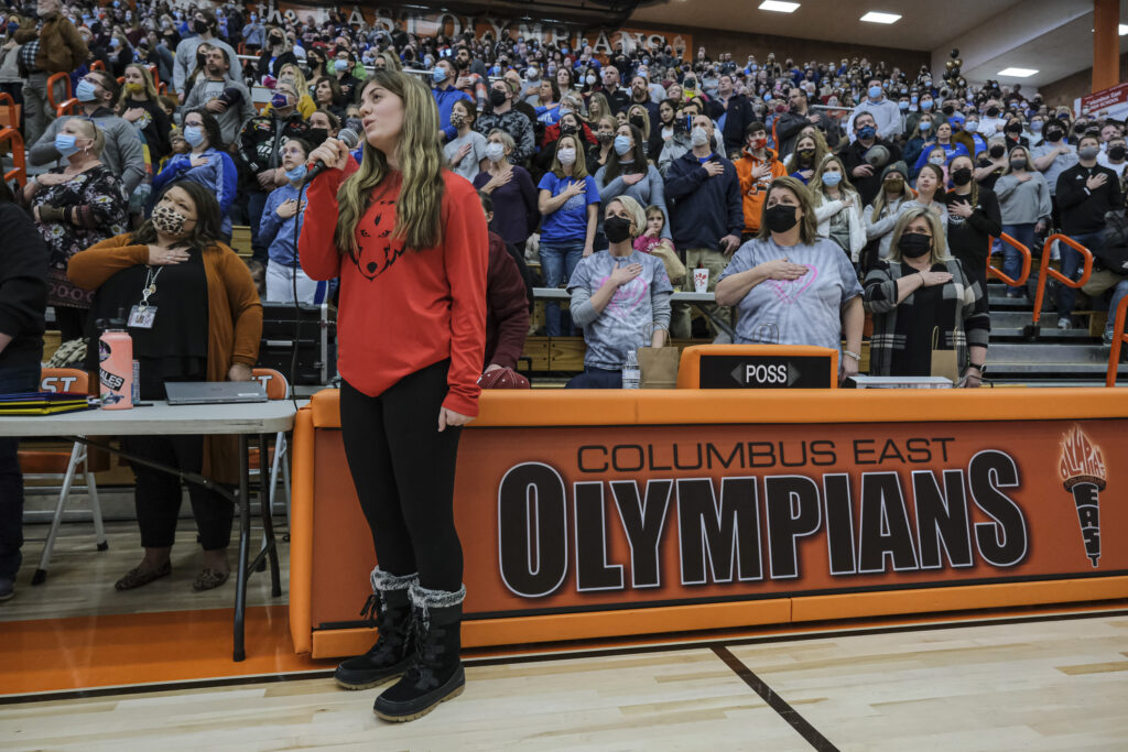Lucy Wilson sings the national anthem during the EBL Super Saturday Cheer Day competition at Columbus East High School in Columbus, Ind., Saturday, Feb. 5, 2022.