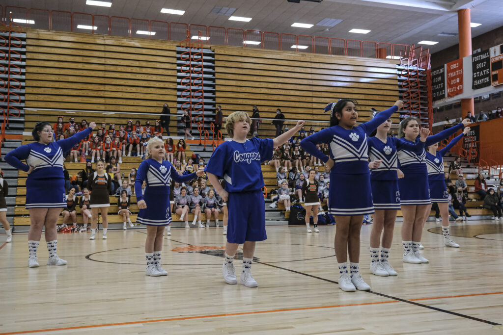Columbus North High School cheerleaders take the floor for an exhibition performance during the EBL Super Saturday Cheer Day competition at Columbus East High School in Columbus, Ind., Saturday, Feb. 5, 2022. Mike Wolanin | The Republic