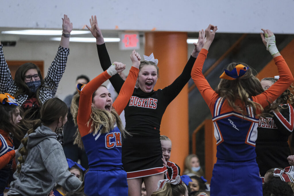 CSA Lincoln Huskies cheerleaders and their supporters celebrate after the Huskies won the EBL Super Saturday Cheer Day competition at Columbus East High School in Columbus, Ind., Saturday, Feb. 5, 2022. Mike Wolanin | The Republic