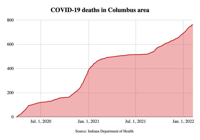 As of Monday, a total of 764 people in and around Columbus had died from the virus, including 126 deaths since Thanksgiving and 69 since New Year’s Day, according to the Indiana Department of Health.