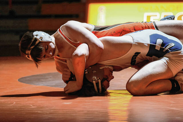 Columbus East’s Kenton Wilson, top, competes against Brownsburg’s Bryce Johnson in a 145-pound wrestling match at Columbus East High School in Columbus, Ind., Friday, Jan. 21. 2022.