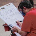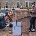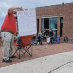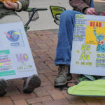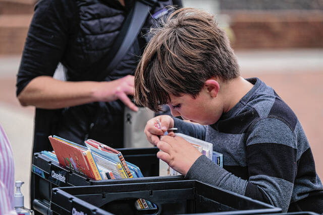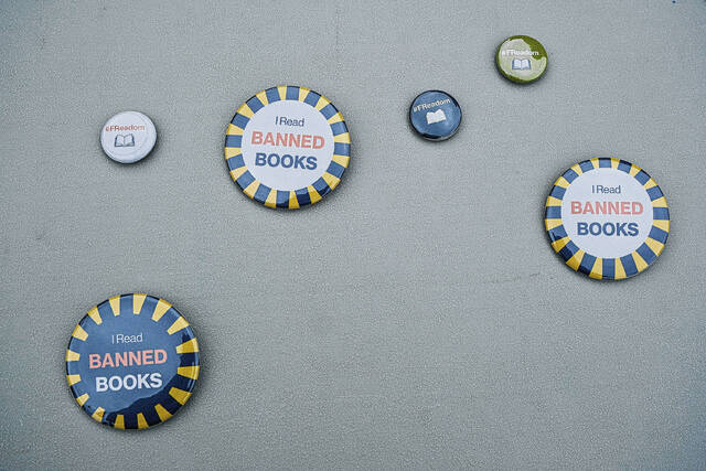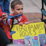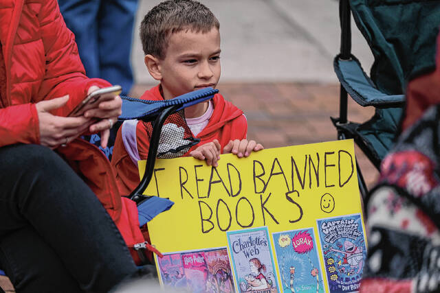The crowd included youngsters such as 7-year-old Boden Keele. He brought a sign with him that read “I Read Banned Books.” The sign included covers of works ranging from the Harry Potter series to “Charlotte’s Web.”