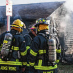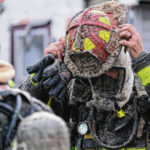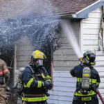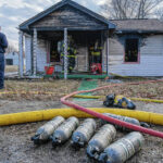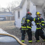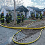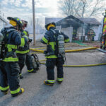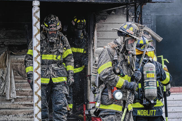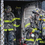 Mike Wolanin | The Republic Columbus firefighters emerge from a house covered in insulation, soot and other particulate after working a house fire at 217 Ross St. in Columbus, Ind., Wednesday, Feb. 16, 2022.