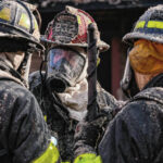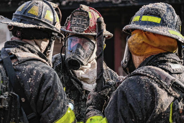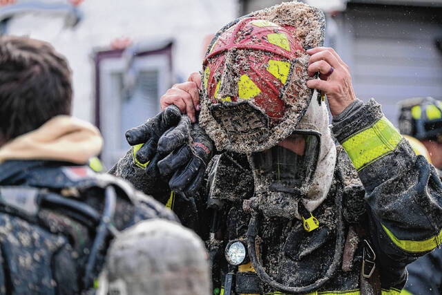 Mike Wolanin | The Republic The turnout gear of Columbus Fire Capt. Josh Allman, center, and firefighters Marcus Gruner, left, and Craig Johannigman, right, is covered in insulation, soot and other particulate after working the interior of a house fire at 217 Ross St. in Columbus, Ind., Wednesday, Feb. 16, 2022.