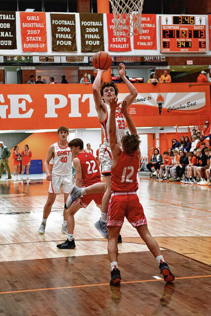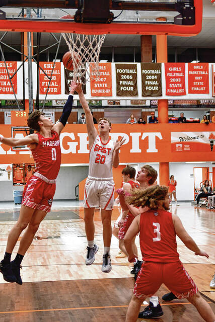 Columbus East’s Will Rieckers shoots over Madison’s Quincy Reynolds on Friday in the Orange Pit at Columbus East High School.