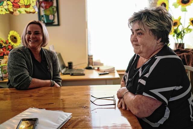 Alena McCarron, left, sits in on an interview with Olesya Whitfield, owner of Olesya’s Kitchen in Columbus. A GoFundMe campaign has been launched to help Whitfield move her restaurant from its current location after the land where the business is located was purchased.