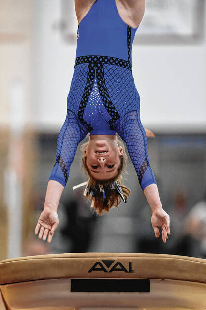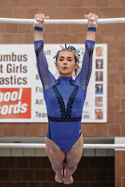 East’s Cami Warren finished third on the vault (8.8), beam (8.7) and floor (8.95) en route to a third-place all-around finish with a 34.2. Winter Shaver took fourth on the vault (8.7) and fifth in the all-around (32.8). Reagan Mount was third on the bars (8.35).