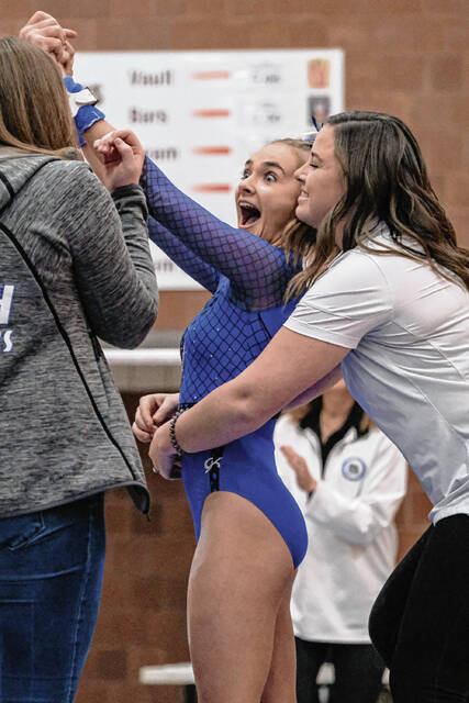 Columbus North’s Reese Euler, center, celebrates with teammates and co-coach Kaitlyn Rediker after a successful bars routine during a gymnastics meet at Columbus East High School in Columbus, Ind., Monday, Feb. 21, 2022.