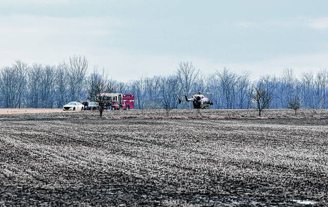 Firefighters from multiple agencies respond to a plane crash Monday at the Franklin Flying Field south of Franklin. The pilot of the aircraft, an 83-year-old Brownsburg man, was flown to an Indianapolis hospital where he was in serious condition.