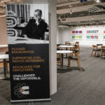 Mike Wolanin | The Republic A banner of J. Irwin Miller, former president and chairman of Cummins, is visible in a gathering space in the basement of the newly remodeled Cummins Corporate Office building in Columbus, Ind., pictured Tuesday, July 23, 2019.