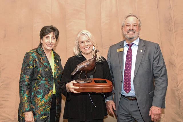 National Wild Turkey Federation CEO Becky Humphries, Missouri Department of Conservation Director Sara Parker Pauley and NWTF Board Chairman Harlan Starr pose for a photo at the NWFT annual convention in Nashville, Tennessee.