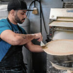 Mike Wolanin | The Republic Bucceto’s Pizza Pasta manager Julian White preps pizza dough to be made into pizzas at Bucceto’s in downtown Columbus, Ind., Friday, Feb. 18, 2022. Non-profit organization Bartholomew County Work helped White get his jobs at Bucceto’s after he got out of prison. He started as a bus boy and now manages the restaurant. Bartholomew County Works helps unemployed and under-employed people find work.